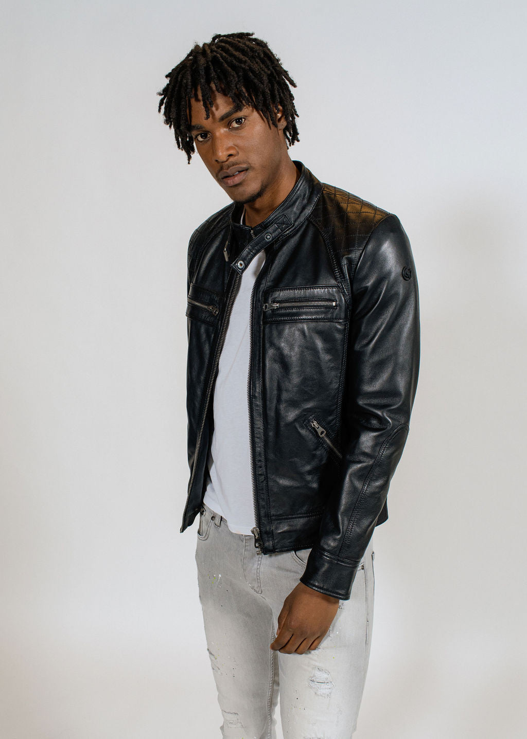 Le blouson en cuir BALBOA HOLSTER est en cuir de mouton. Il se compose de 4 poches à l'avant zippées, un col mao à pressions, un badge sur le bras gauche et des épaulettes travaillées en surpiqure. La coupe et les manches sont droits.
