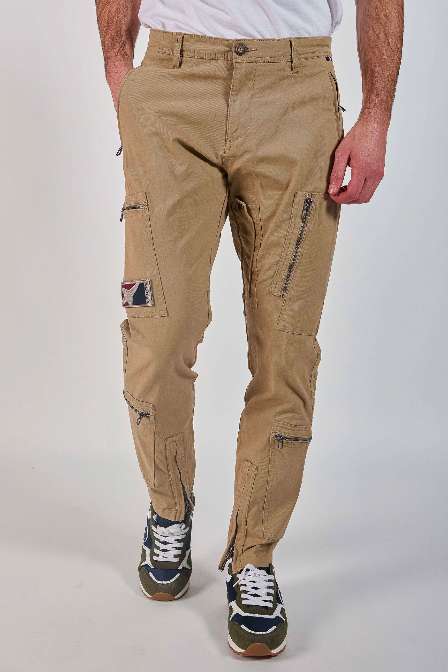 Pantalon MACH 1 AIRCRAFT en coton et élasthanne, fermeture avec 1 bouton d'attache et une fermeture éclair, 2 poches zippées latérales hautes, 2 poches zipées au niveau des cuisses (1 poche horizontale et 1 poche latérale), 2 poches zipées horizontales au niveau des tibias, ouverture avec fermeture éclair sur les chevilles, attache avec bouton pression au niveau de la poche zipée verticale sur la partie gauche du pantalon, composition : 98% COTON - 2% ELASTHANNE. Collection Patrouille De France by Redskins.