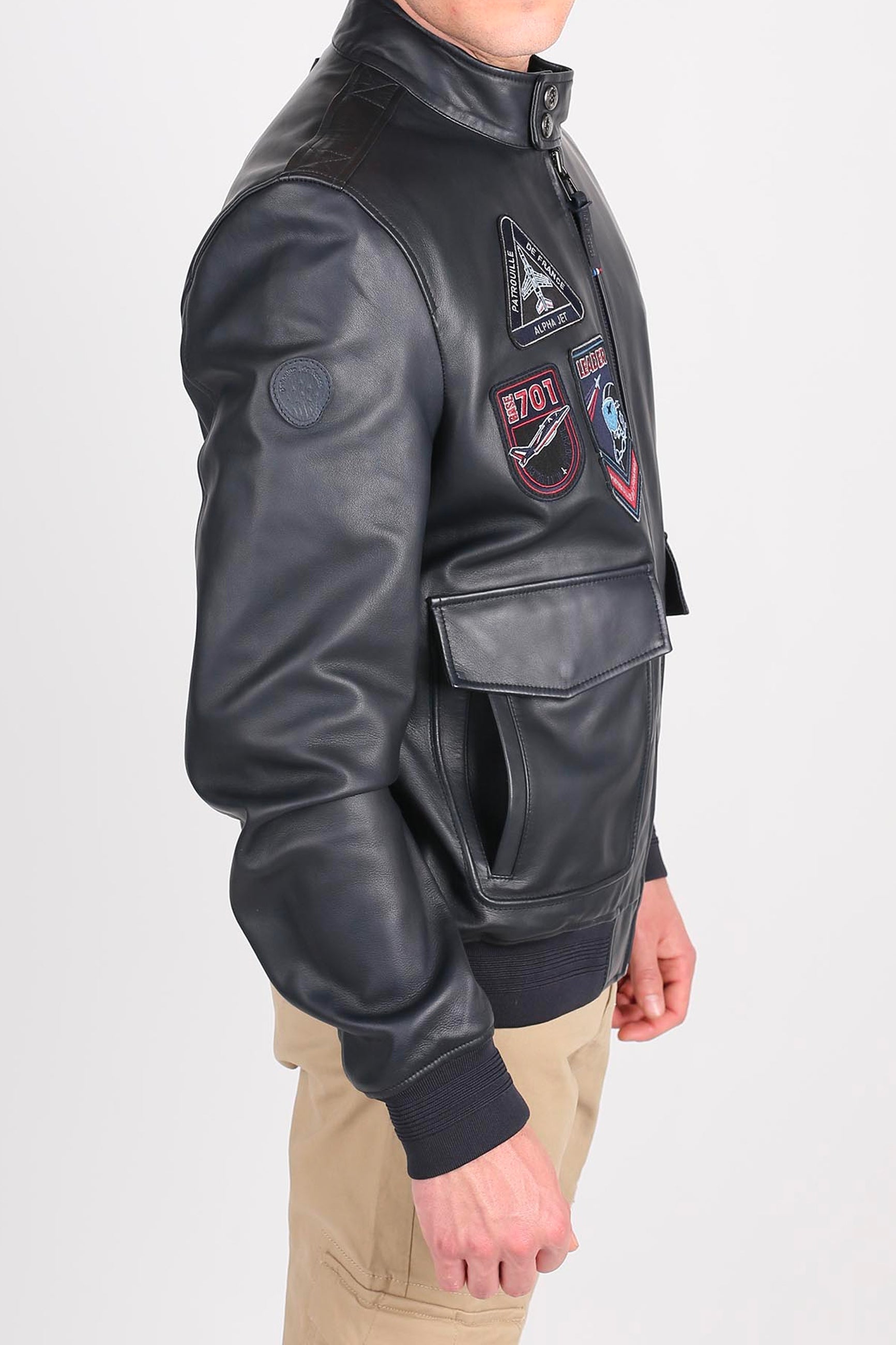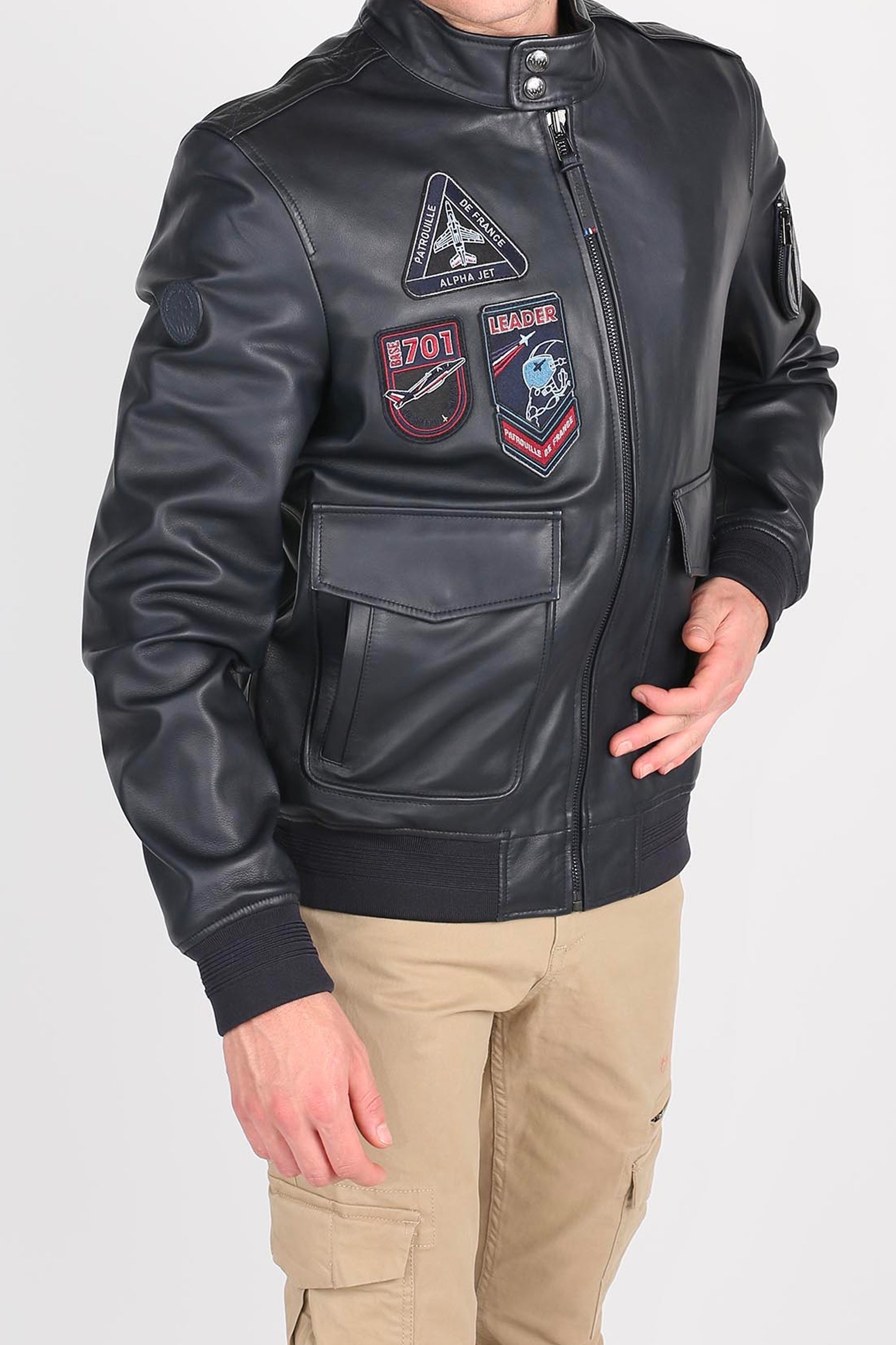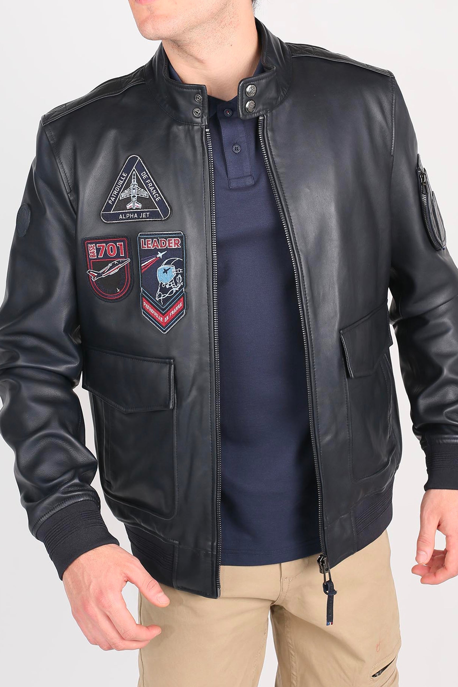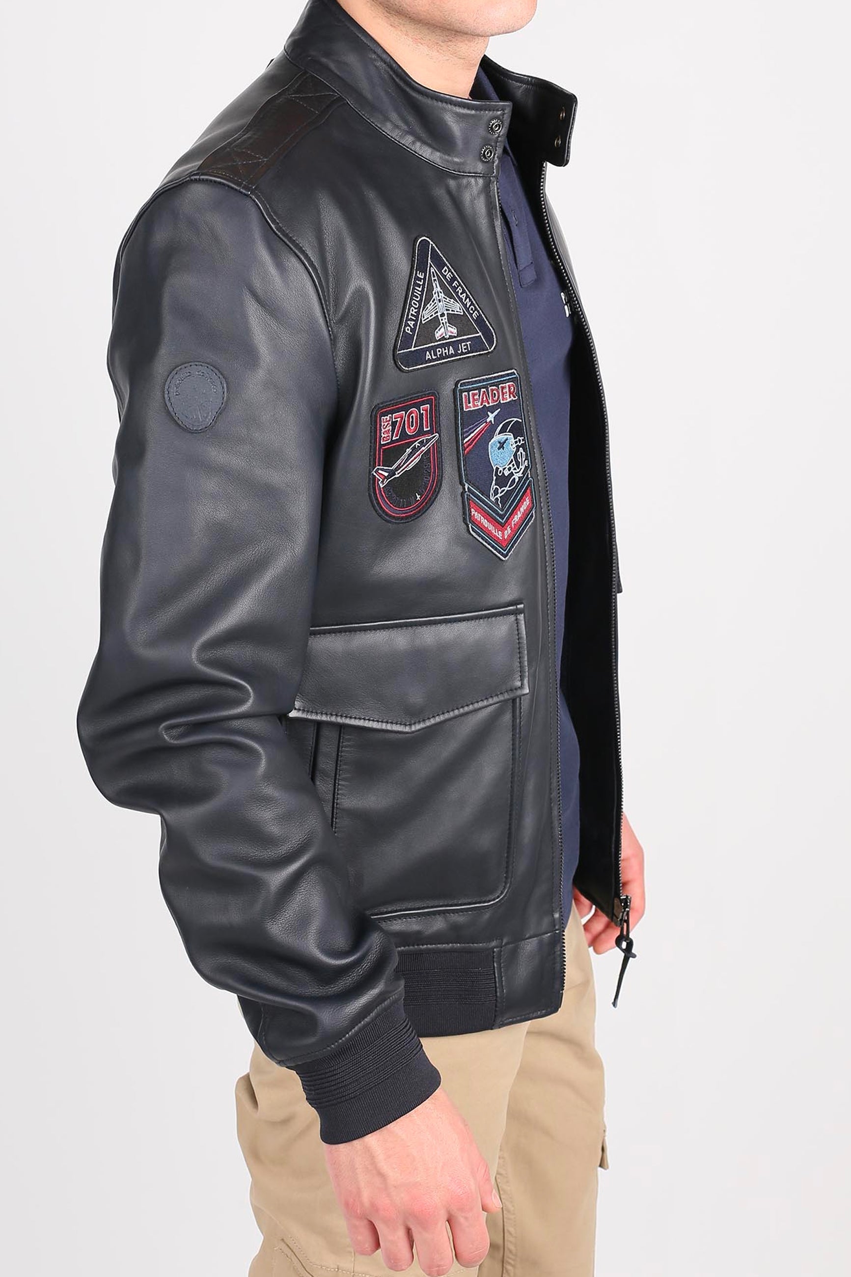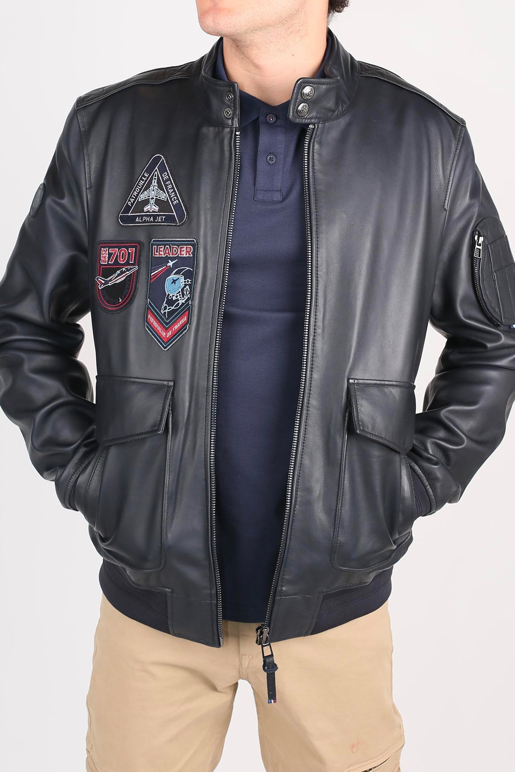 Veste OPIUM NAPOLI en cuir d'agneau, col montant avec fermeture boutons pressions, zip central, 2 poches latérales à rabats avec boutons pressions, 2 poches raglans sur les poches à rabats, logo PATROUILLE DE FRANCE au niveau de l'épaule droite, 3 logos PATROUILLE DE FRANCE brodés au niveau du torse côté droit, poche zipée arrondie au niveau de l'épaule gauche, petit drapeau français brodé sous la poche de l'épaule gauche. Collection Patrouille De France by Redskins.