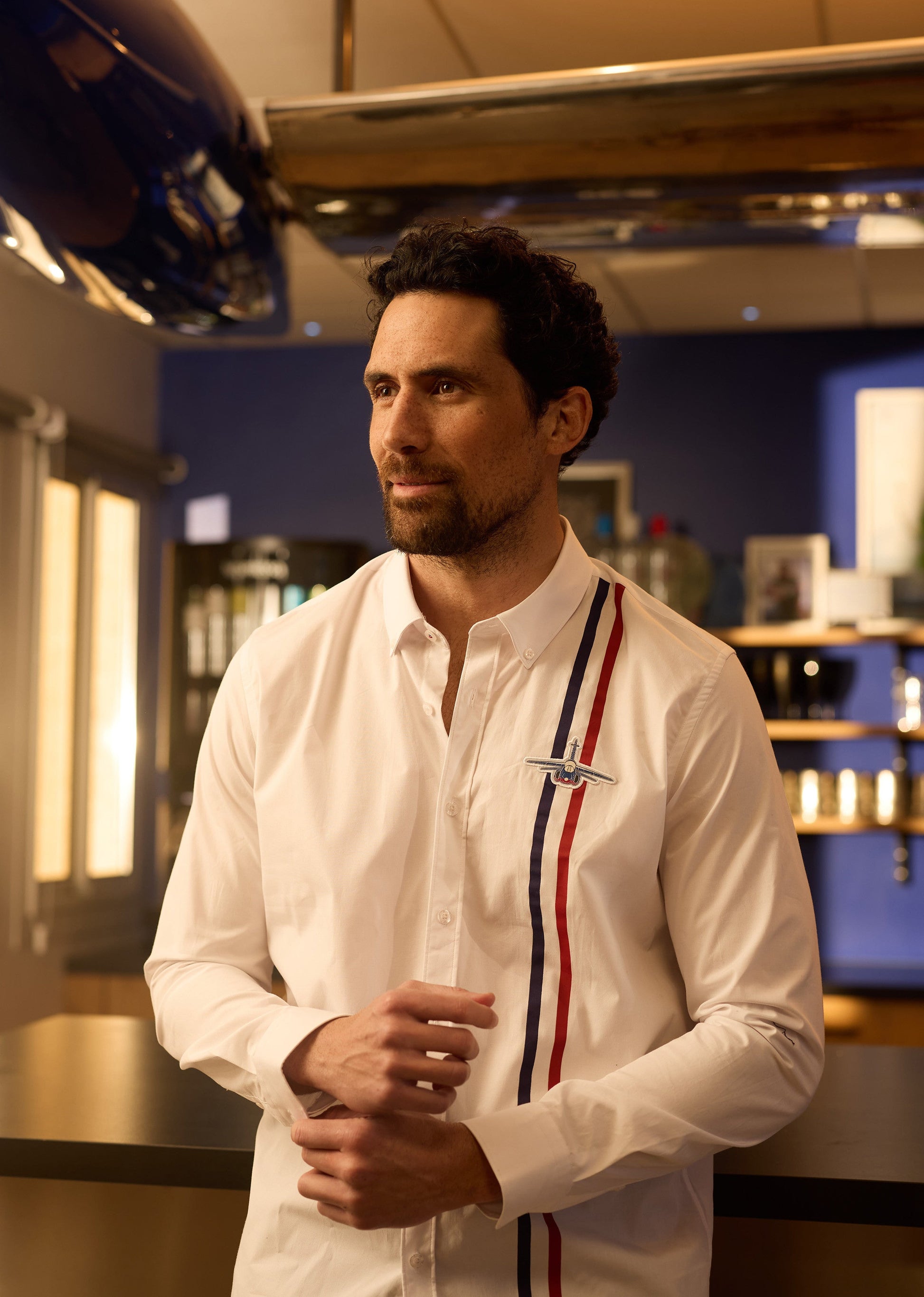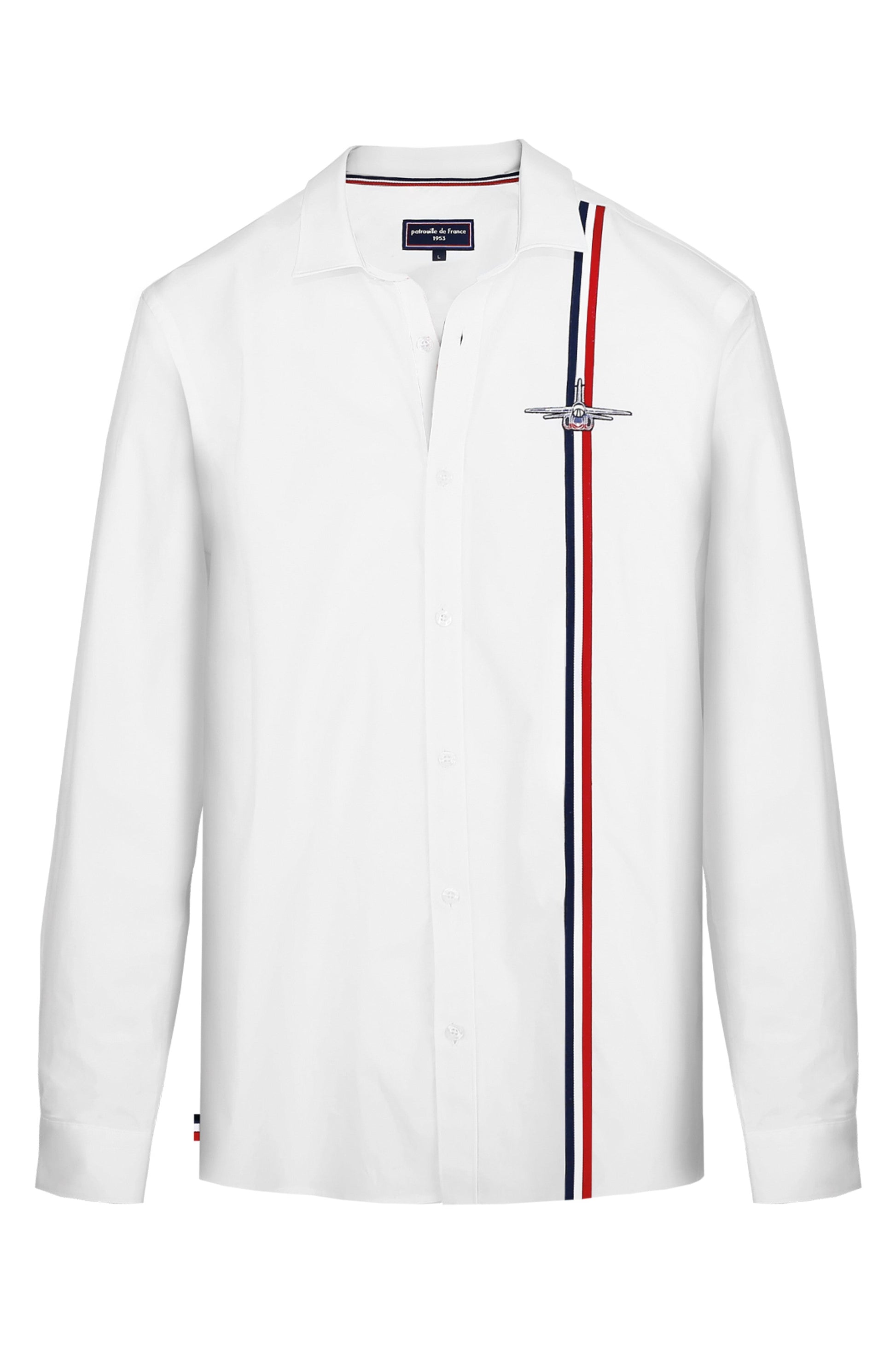 Chemise OWENS TRIOMPHE en coton et élasthanne, attache avec boutons, drapeau français étendu du bas en haut côté cœur avec un avion de la PATROUILLE DE FRANCE par dessus le drapeau, petit drapeau français accroché en bas à droite de la chemise, composition : 97% COTON - 3% ELASTHANNE. Collection Patrouille De France by Redskins.