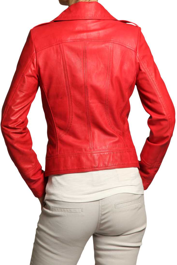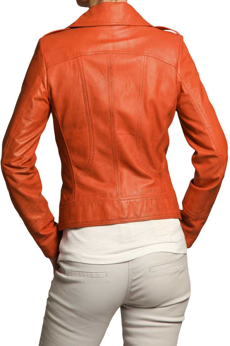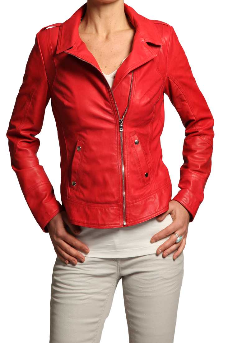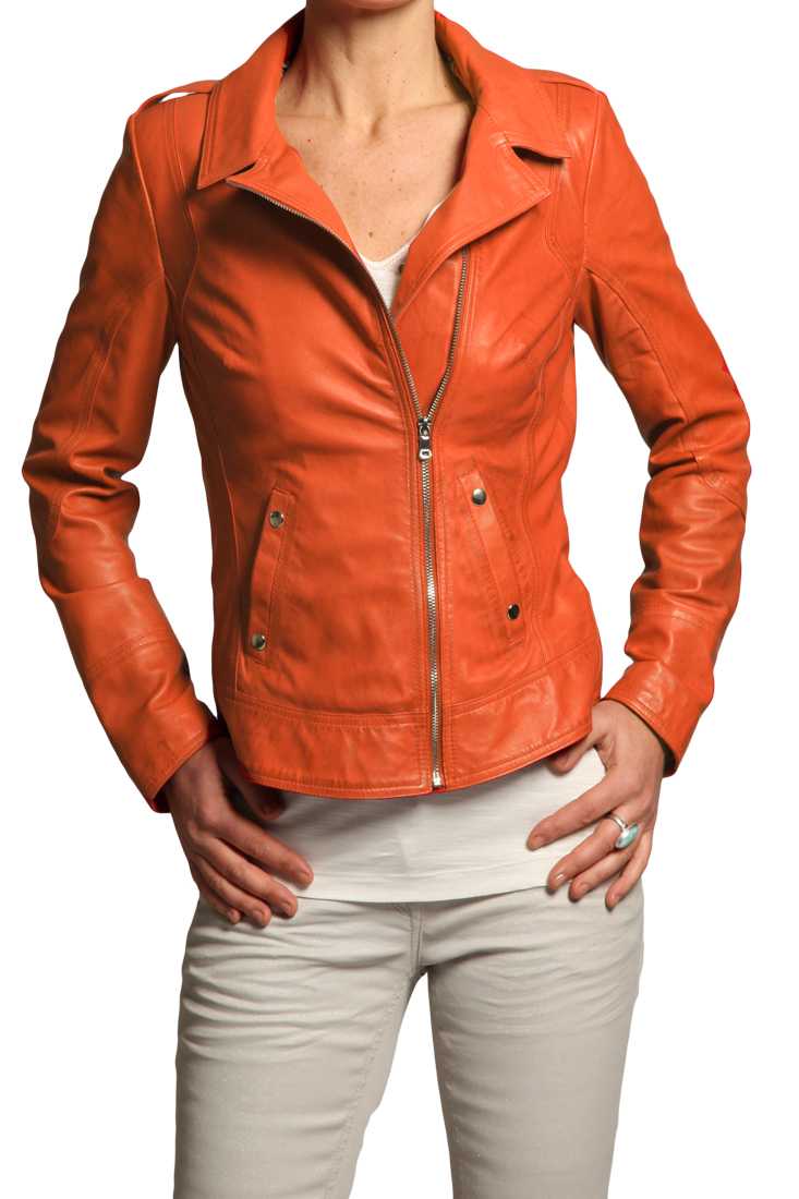 Blouson en cuir de mouton, avec un col à revers croisé, Fermeture par un zip métal en biais - Découpes épaules et manches - Pinces poitrine - Pattes épaules avec pressions - Poches passepoilées et fermées par 2 pressions - Découpes poignets - Doublure Imprimée
