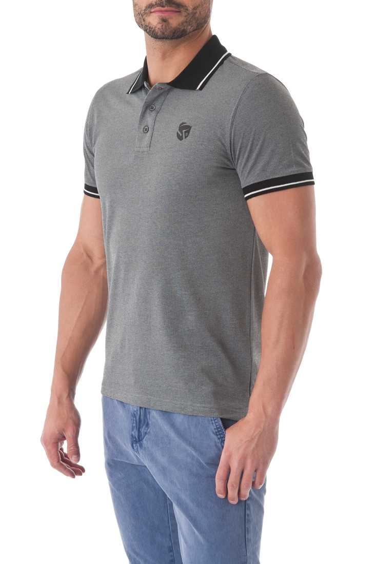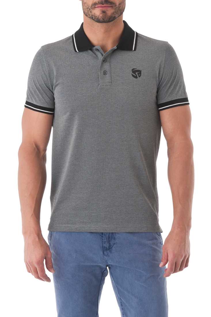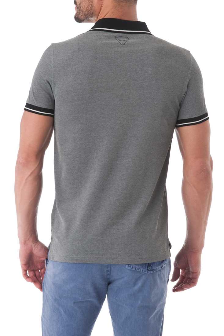 Polo en coton polyester, Manches courtes – Col Polo boutonné, 3 boutons – Bas de manches noir avec une rayure blanche – Coupe près du corps – Sérigraphie sur la poitrine côté cœur – Petite sérigraphie contrastée en forme triangulaire sous l’encolure au dos.