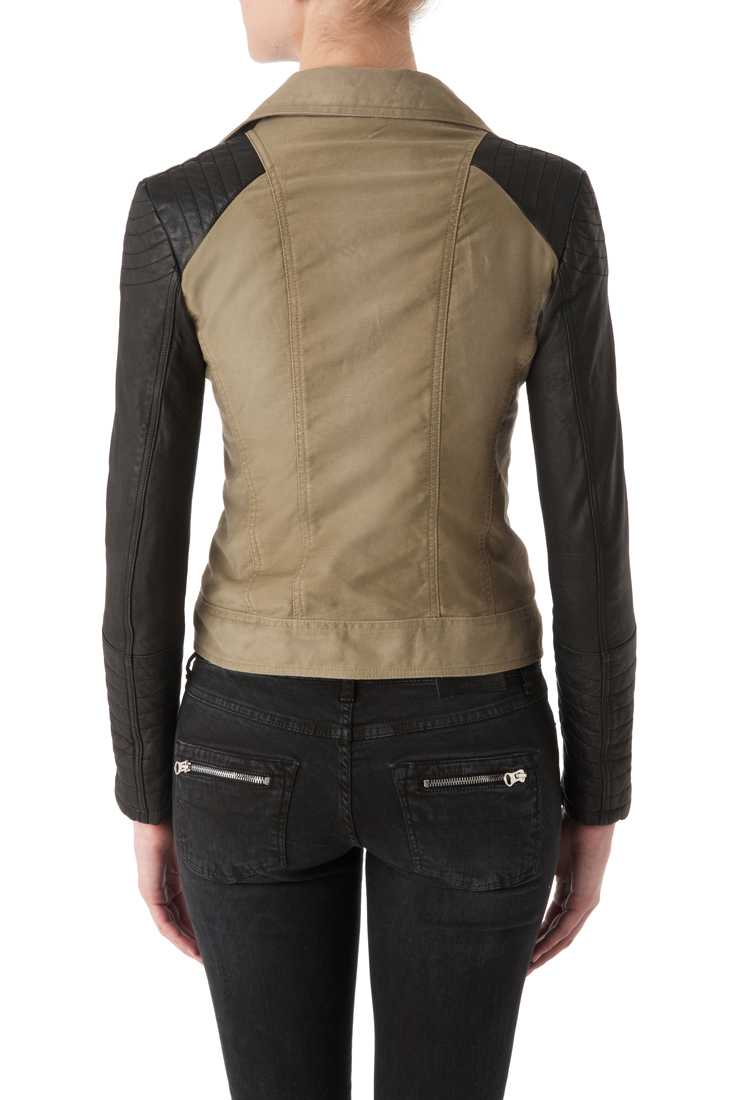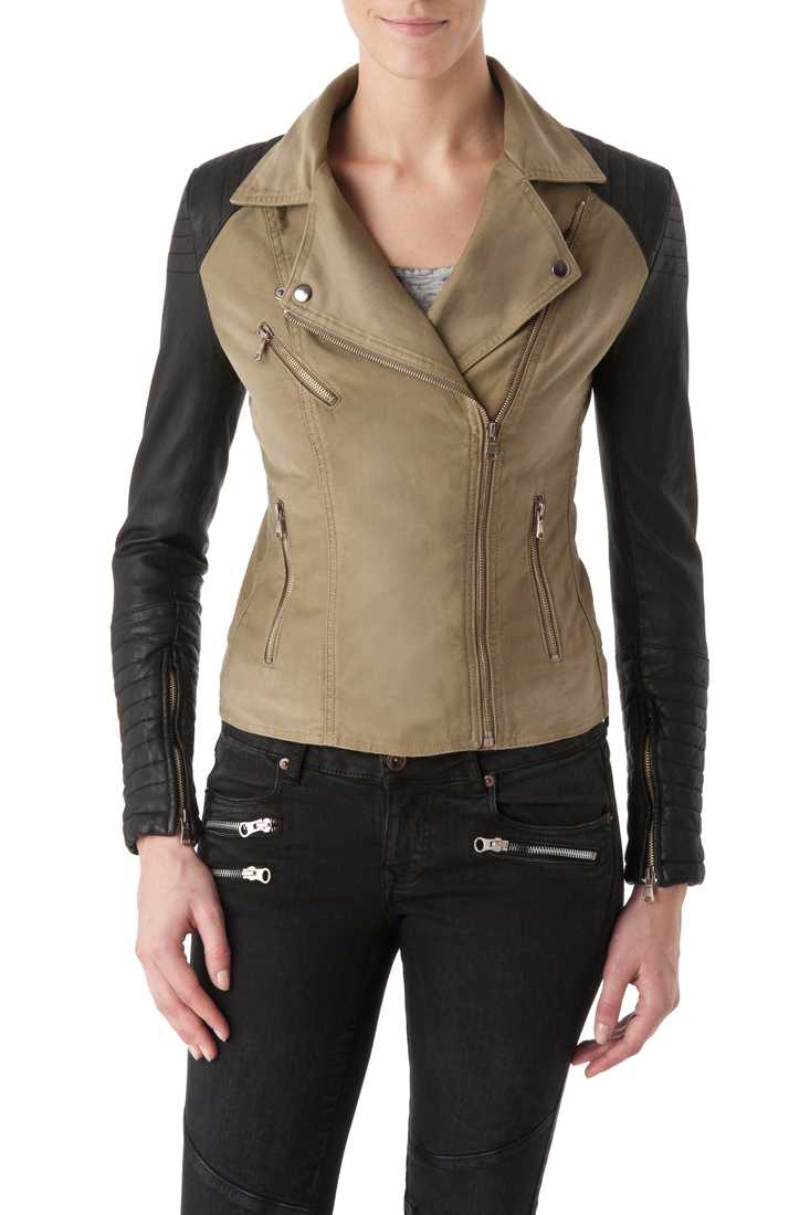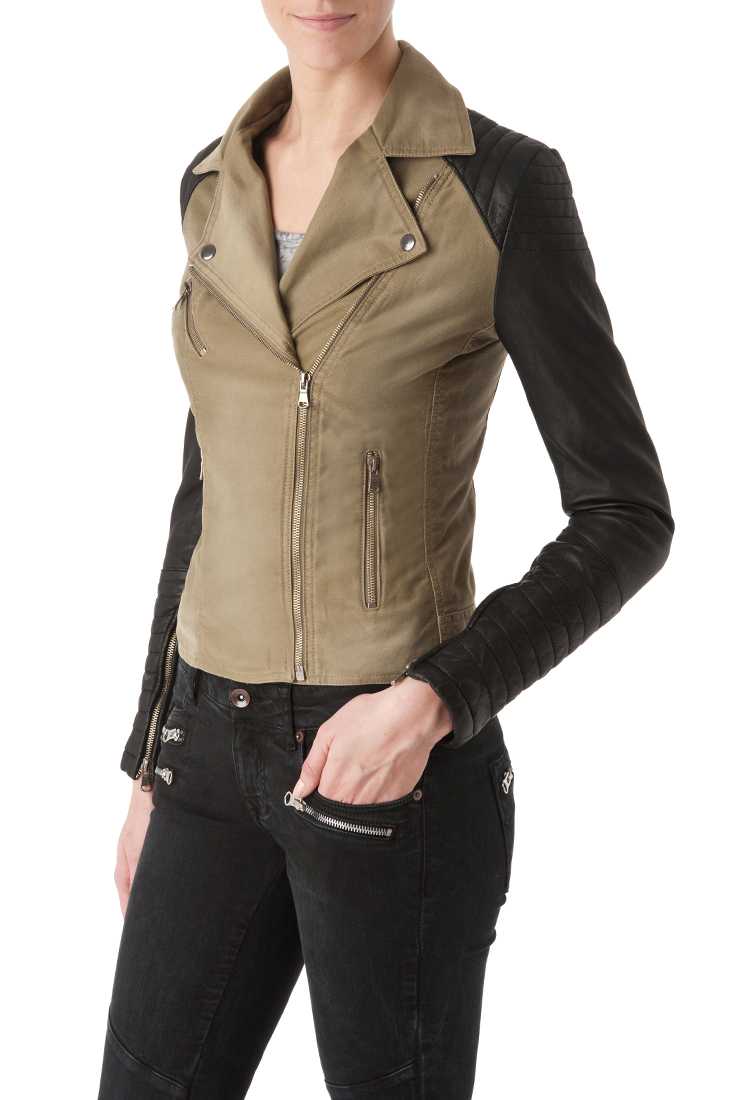 Blouson en coton et cuir d'agneau, avec un col à revers croisé, Fermeture par un zip métal en biais, Poches zippées devant, corps en toile délavée effet vieilli, Manches en cuir lavé avec effet vieilli, Surpiqûres aux épaules et dans le bas des manches et fermeture avec un zip en bas de manches.