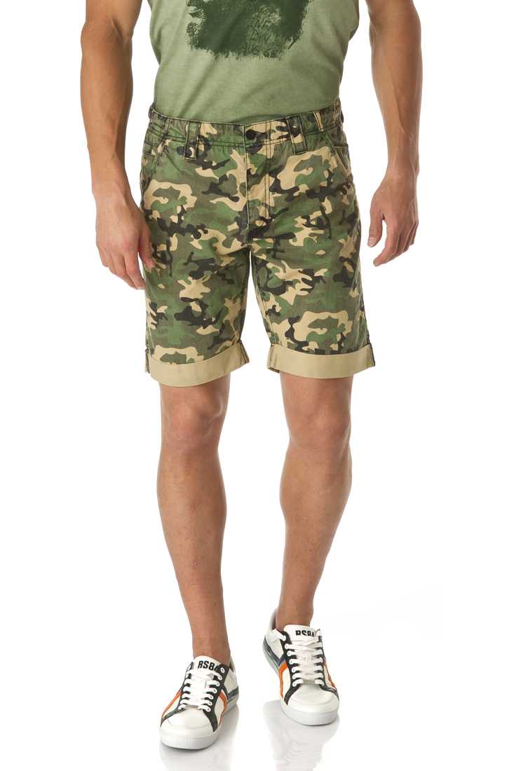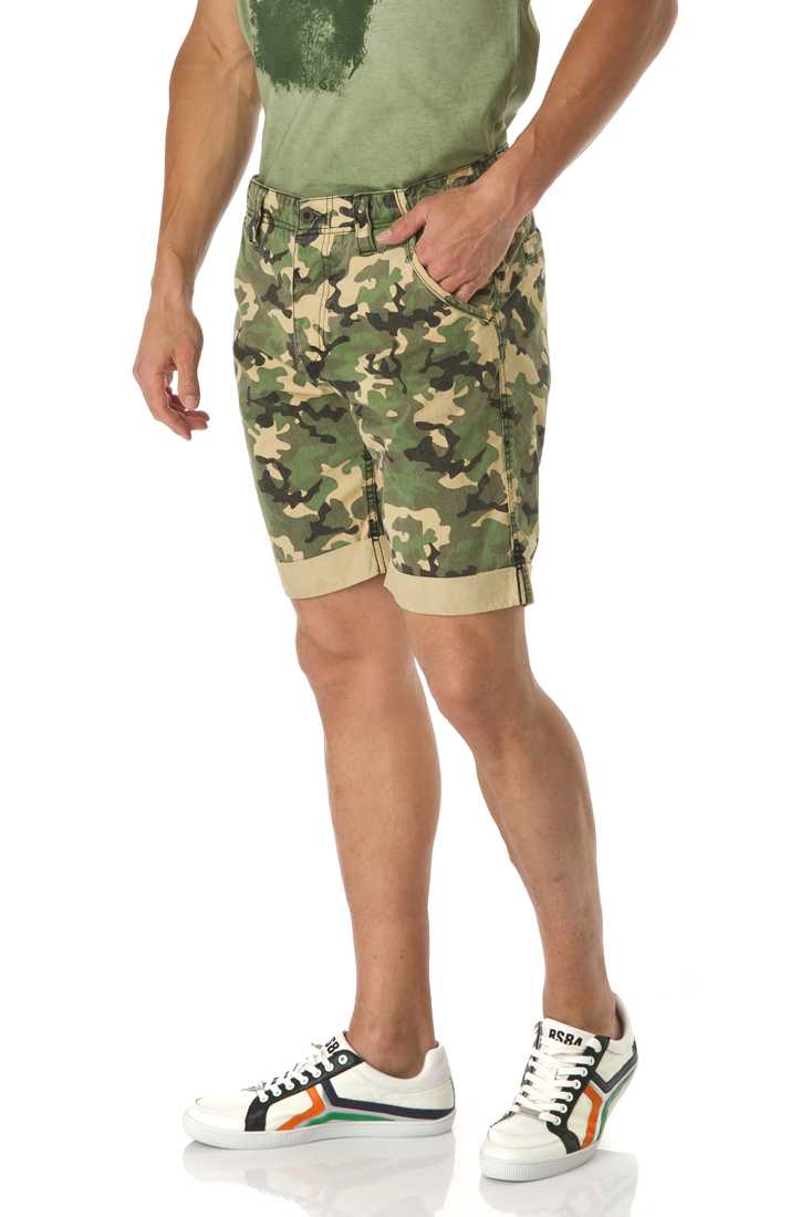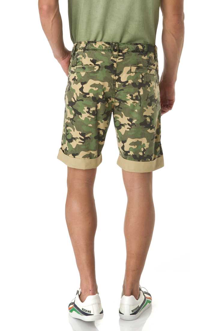 Short en Coton, tissu camouflage avec revers en bas de jambe - 5 poches (2 poches italiennes devant + 1 poche ticket + 2 poches passepoilées au dos - Braguette boutonnée - 5 passants - Cordon de serrage à l'intérieur de la taille - Petit label écru cousu sur le côté droit au porter au niveau de la poche devant - Petit patch cuir cousu centré sur la poche dos côté droit – Les surpiqûres noires