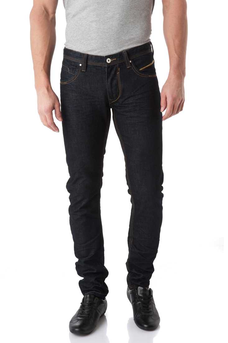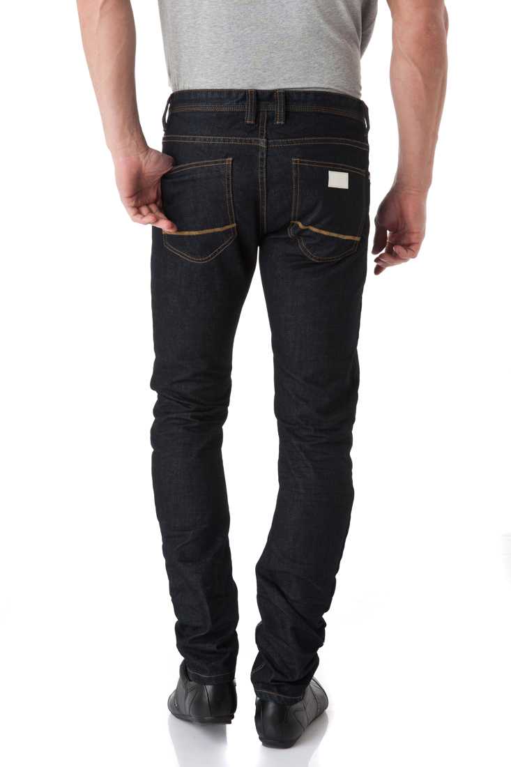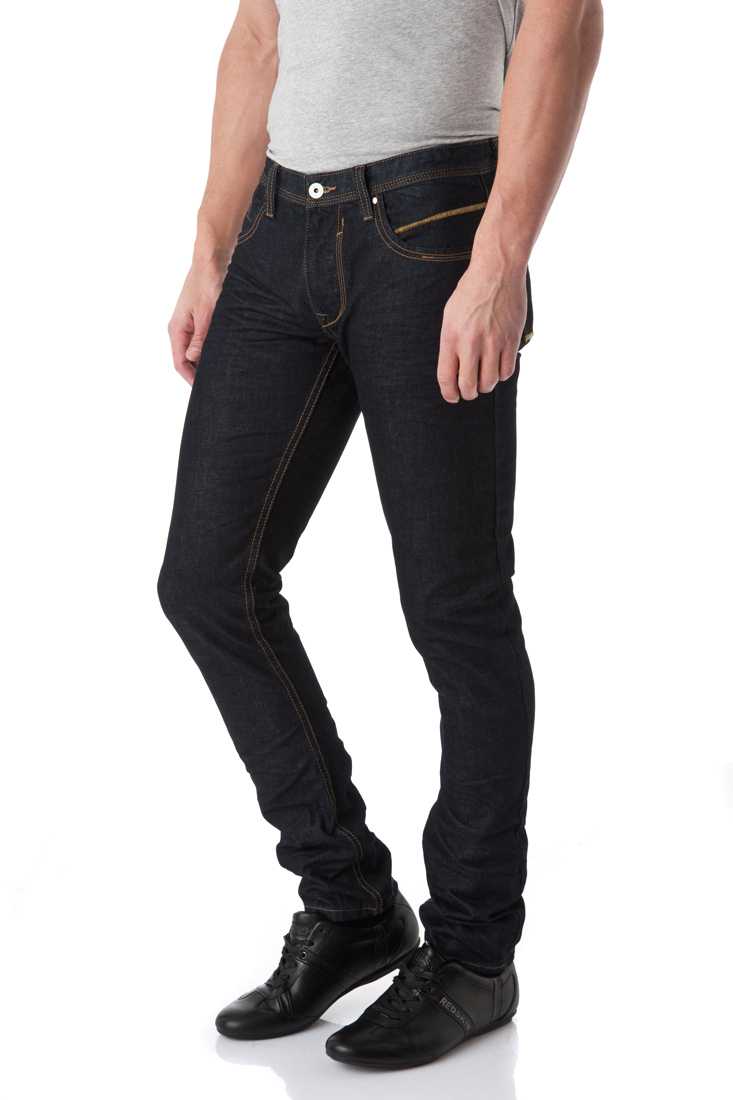 Jeans brut avec le haut des cuisses, derrière les genoux et le bas légèrement froissé - Coupe près du corps Skinny - 5 poches (2 devant + 1 ticket et 2 poches plaquées au dos) - Braguette zippée - 5 passants - Petit label écru cousu devant à cheval sur le bord de la poche droite au porter - Bouton ceinture et rivet en métal blanc – Toutes les surpiqûres sont camel