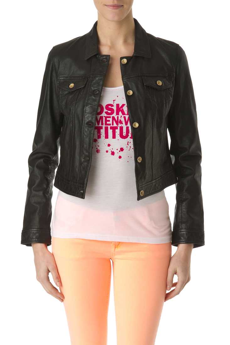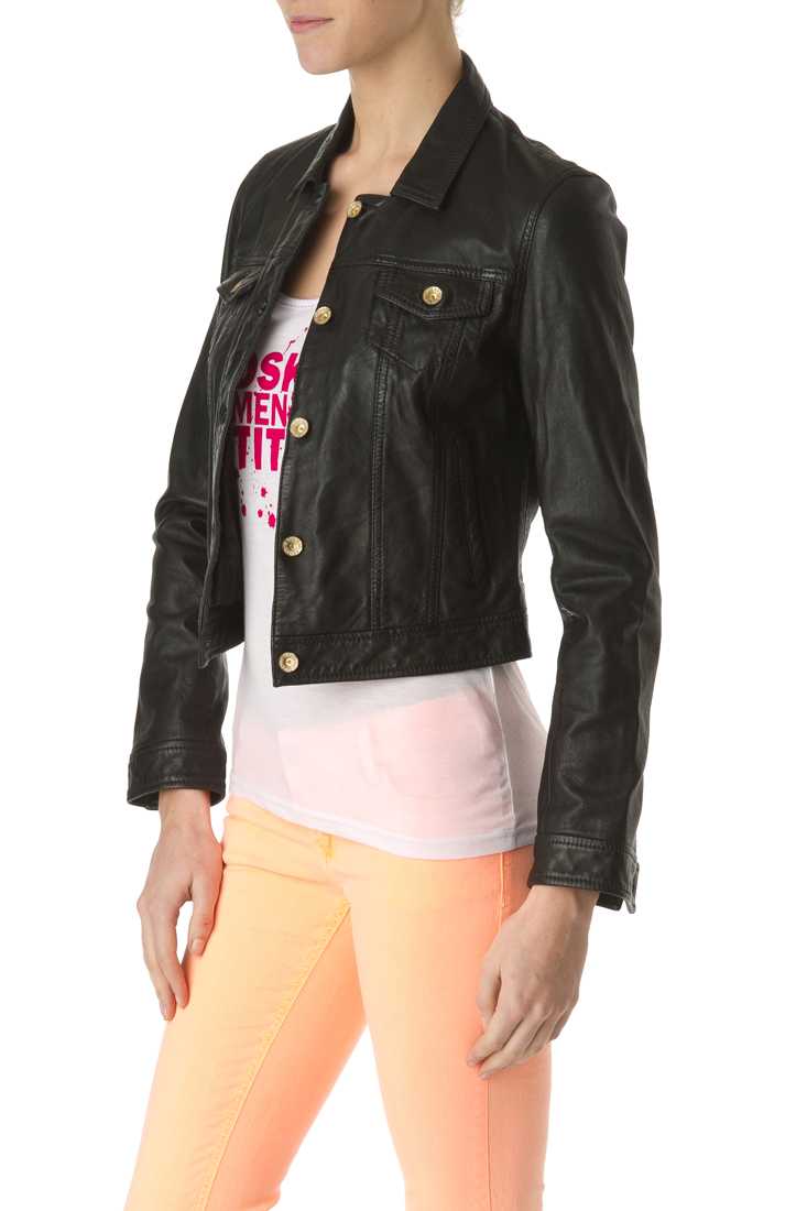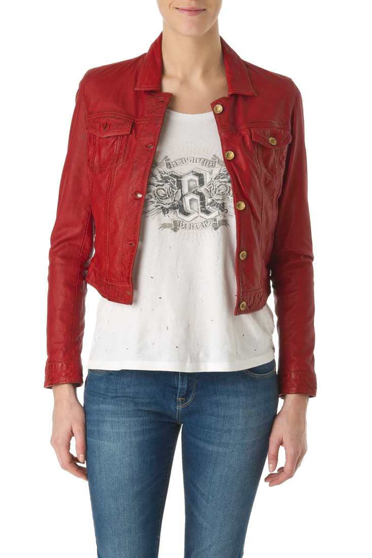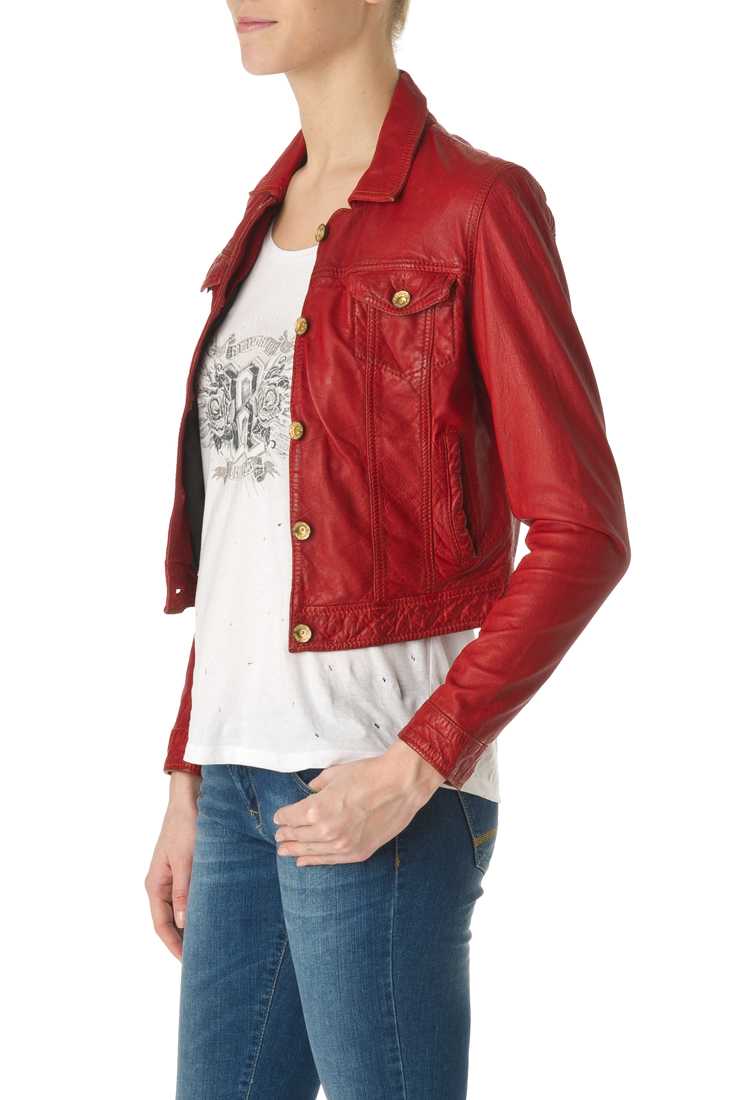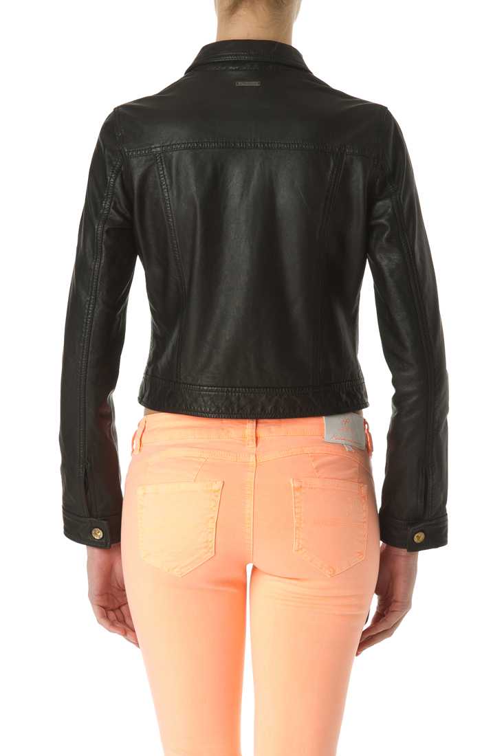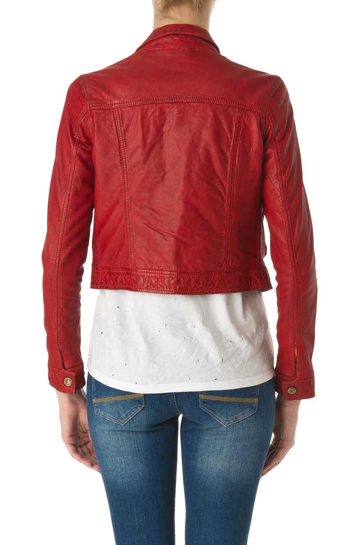 Blouson en cuir de mouton, Col chemisier - Fermeture milieu devant 5 boutons - Rabat de poches poitrine 1 bouton - Poches bas passepoilées- Poignets avec une fente +1 bouton – Plaque métal encolure dos - Doublure imprimée "Tête de mort" en 100 % Acétate.
