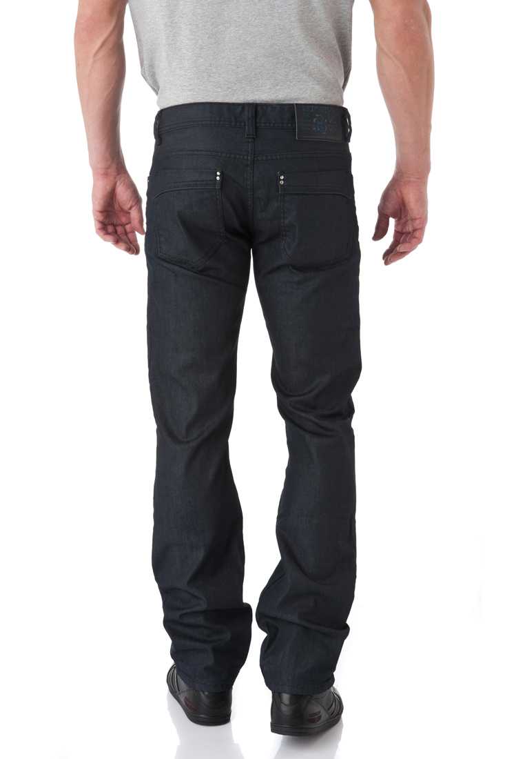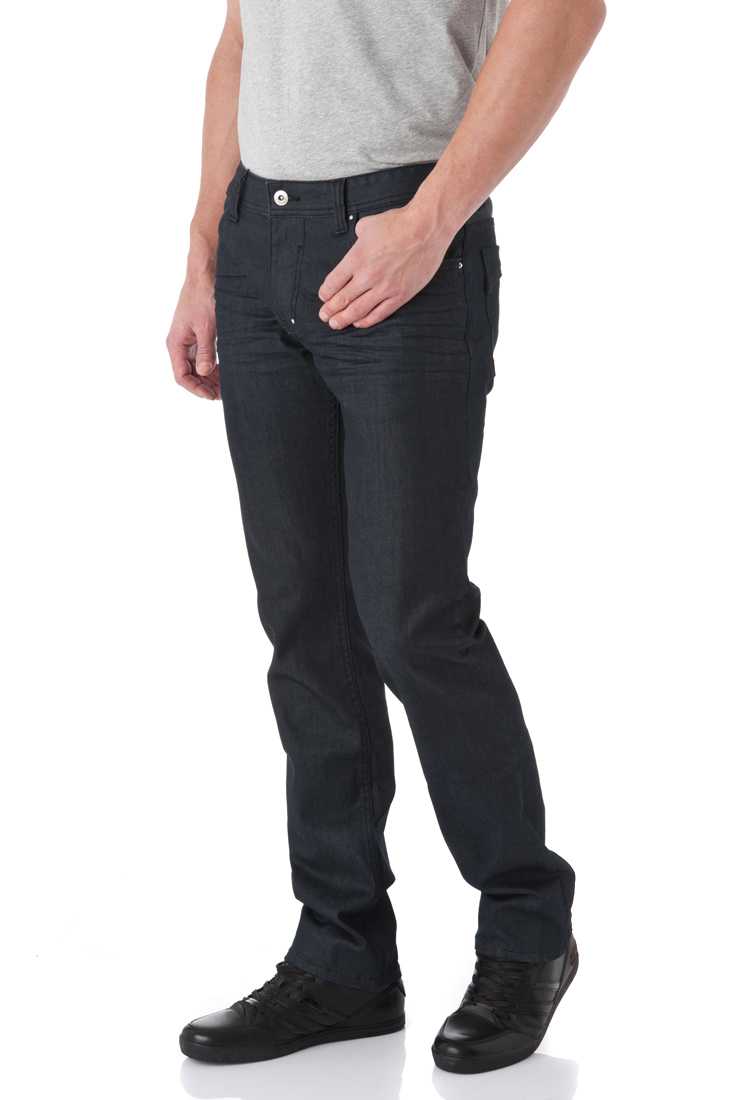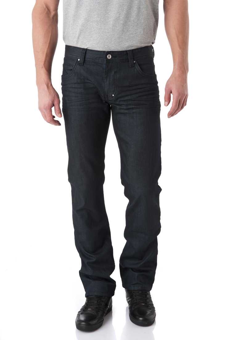 Jeans brut légèrement huilé - Effet froissé en haut des cuisses - Coupe Regular - 5 poches (2 devant + 1 ticket et 2 poches fantaisies plaquées au dos avec 2 petits rivets en métal argenté) - Braguette zippée - 5 passants - Petite griffe métal argenté accrochée sur le bord de la poche droite au porter - Toutes les surpiqûres sont noires