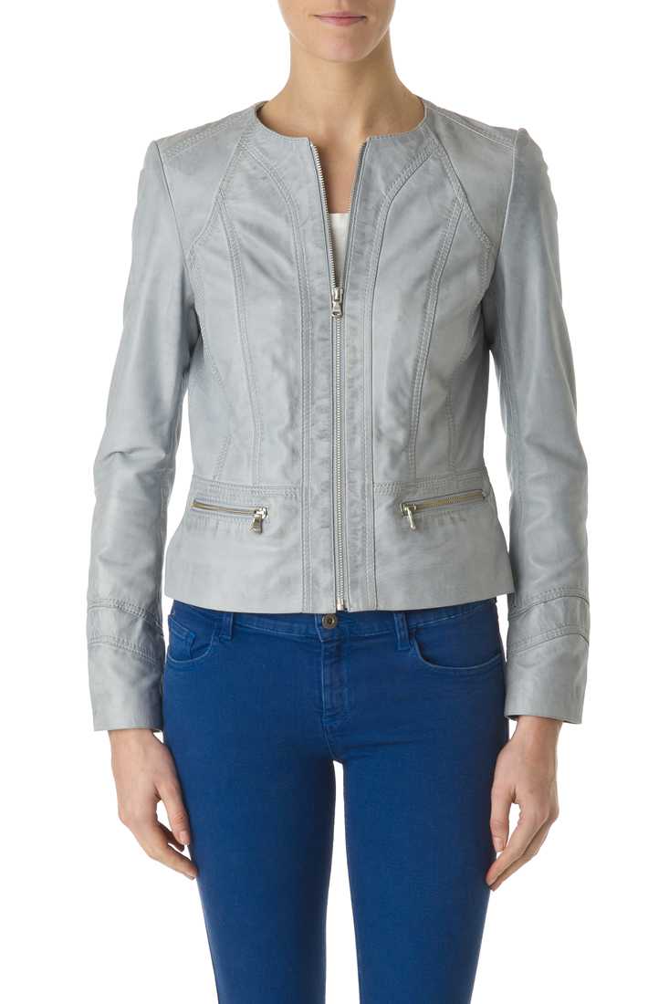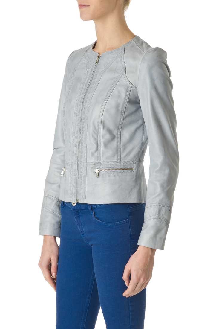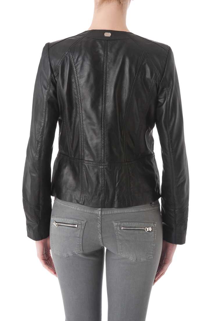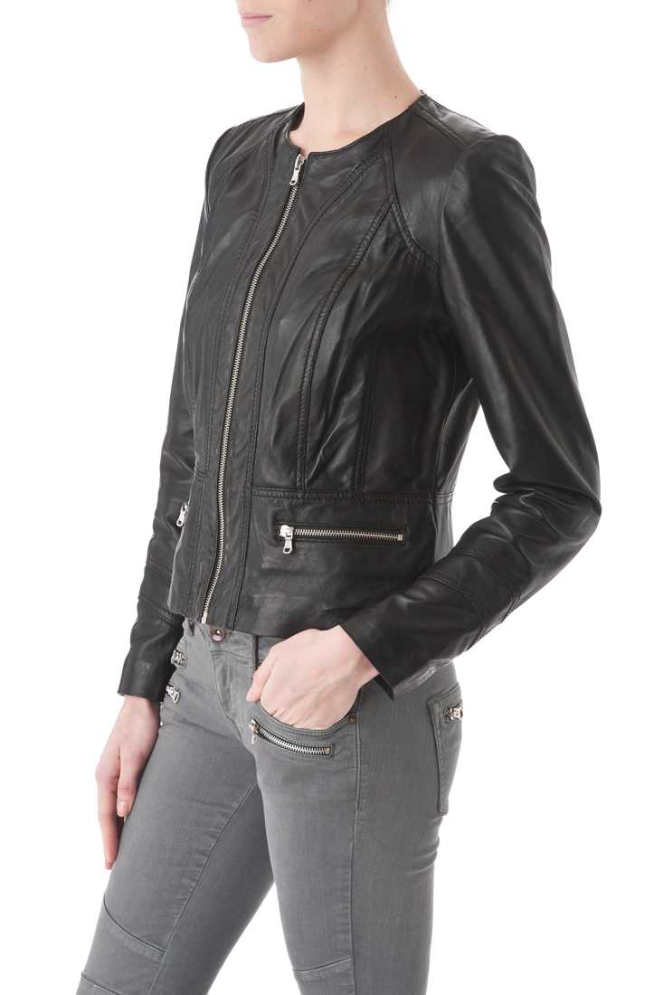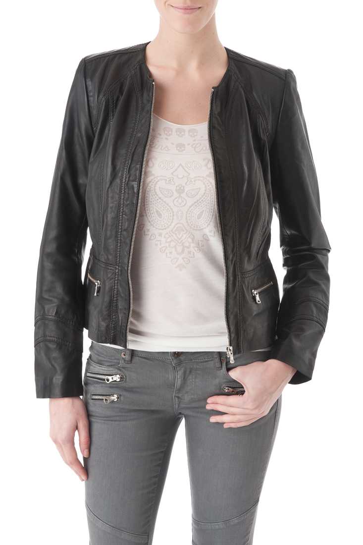 Blouson en cuir de mouton, Sans col - Fermeture zip milieu devant - Empiècements épaules et bas de manches - Découpe au niveau de la taille - Poches bas zippées - Plaque métal sous la poche bas gauche au porté - Doublure imprimée "Redskins" en 100 % viscose.