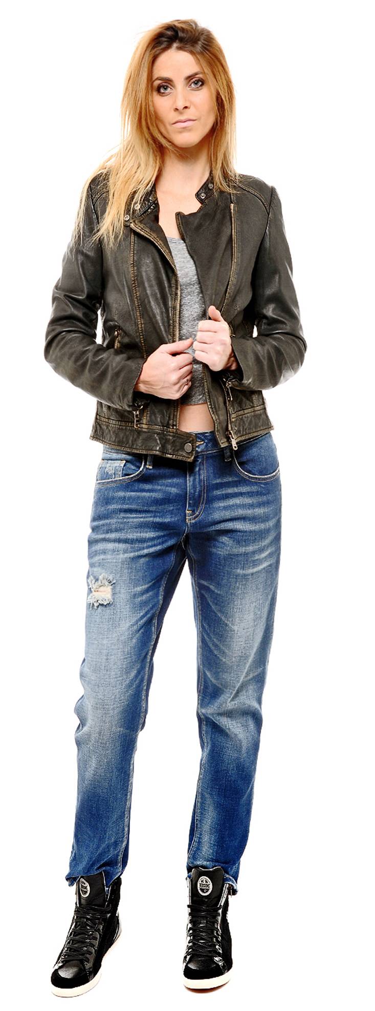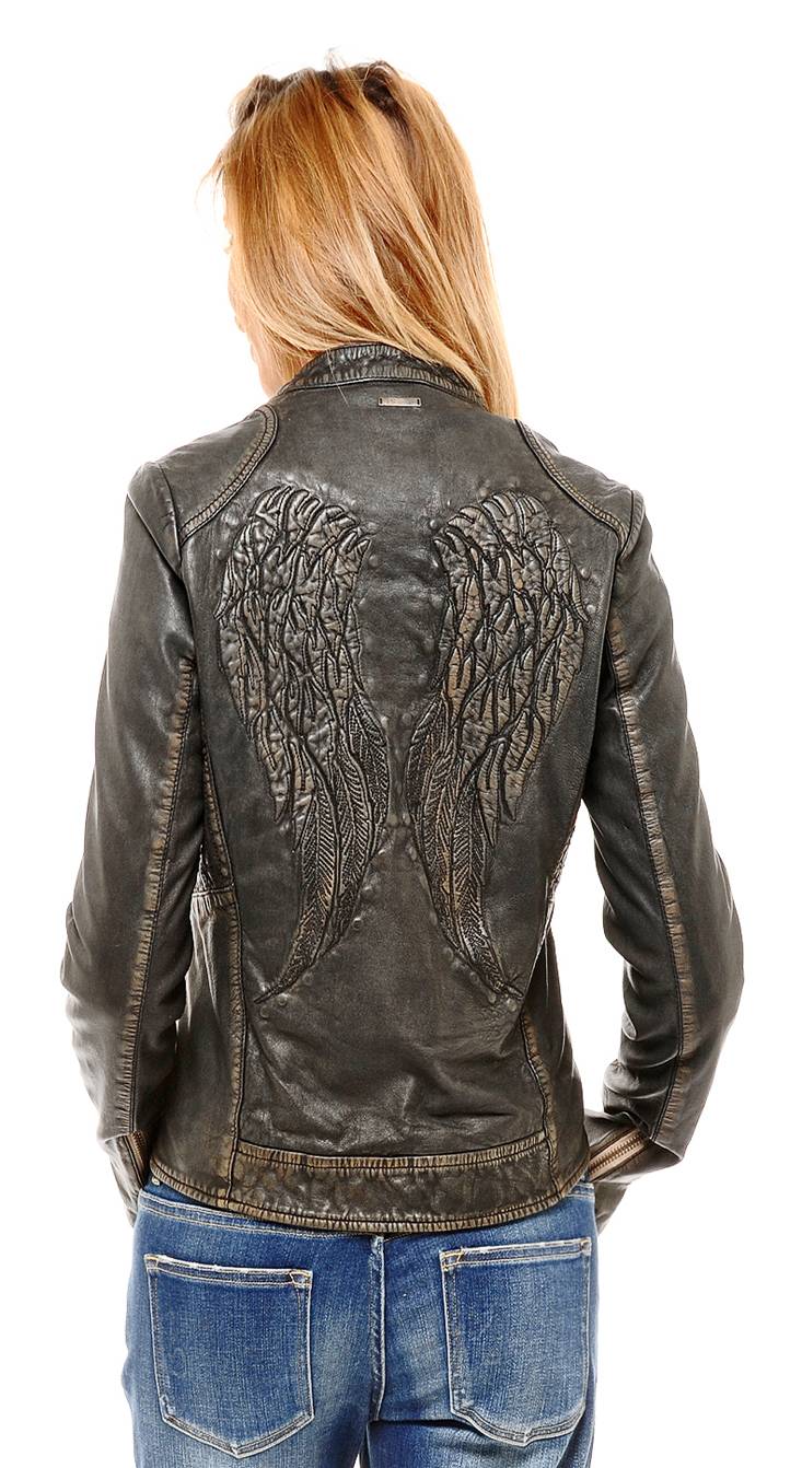 Blouson en cuir de mouton, type Motard, Fermeture à glissière, 2 poches bas de vêtement zippées, Bas de manches zippées. Col fermé par une patte. Motif dans le dos "Ailes et clous" en relief. Doublure 100 % coton motif « Zèbre ».