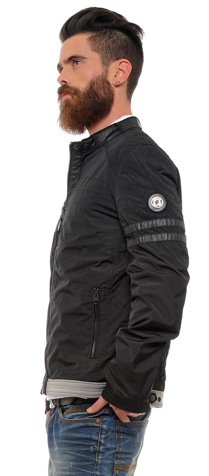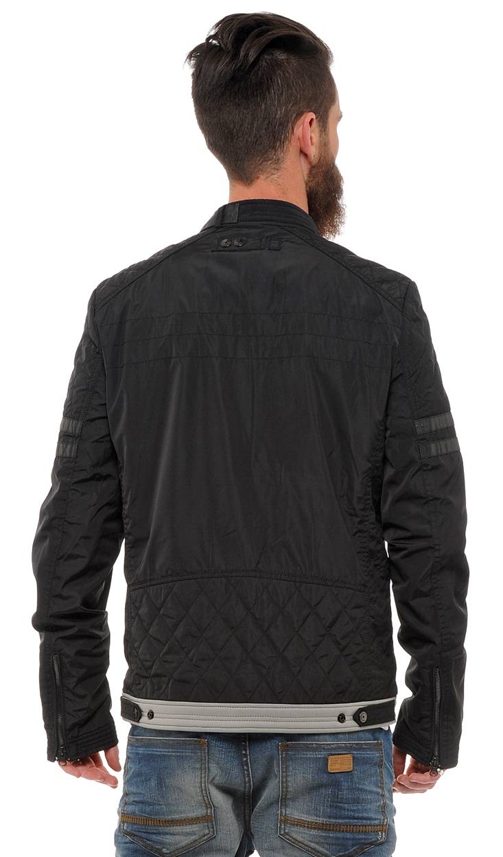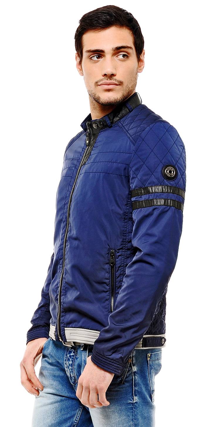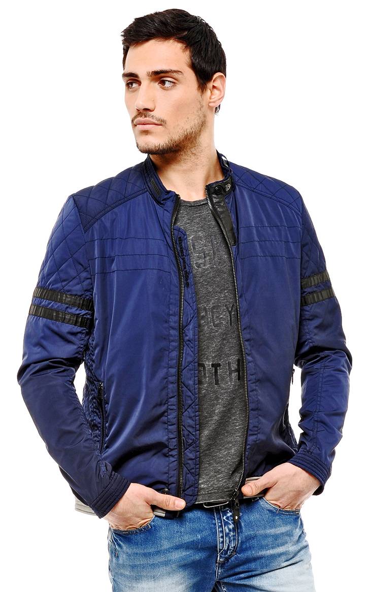 Blouson en polyester, esprit Moto, fermeture milieu devant par un zip métal et petit col montant avec label de marque plastique et 1/2 bande fantaisie en tissu contrasté effet Jeans enduit - Poignets zippés - Jeux de matelassage et surpiqures fantaisies - 2 poches zippées en bas - Bandes en tissu contrasté jeans enduit sur le haut des manches - Ceinture grise avec pattes de serrage sur les côtés et fantaisie sous le col dos. À l'intérieur : doublure filet grise avec sérigraphie noire et 2 poches zippées vertical.