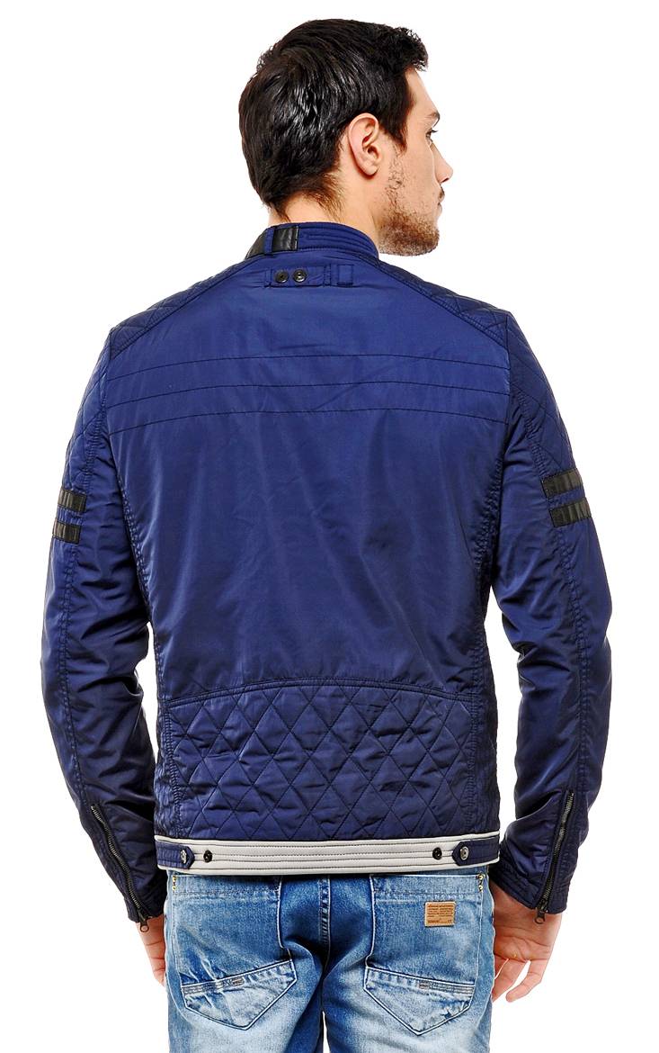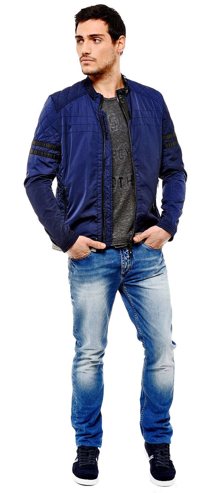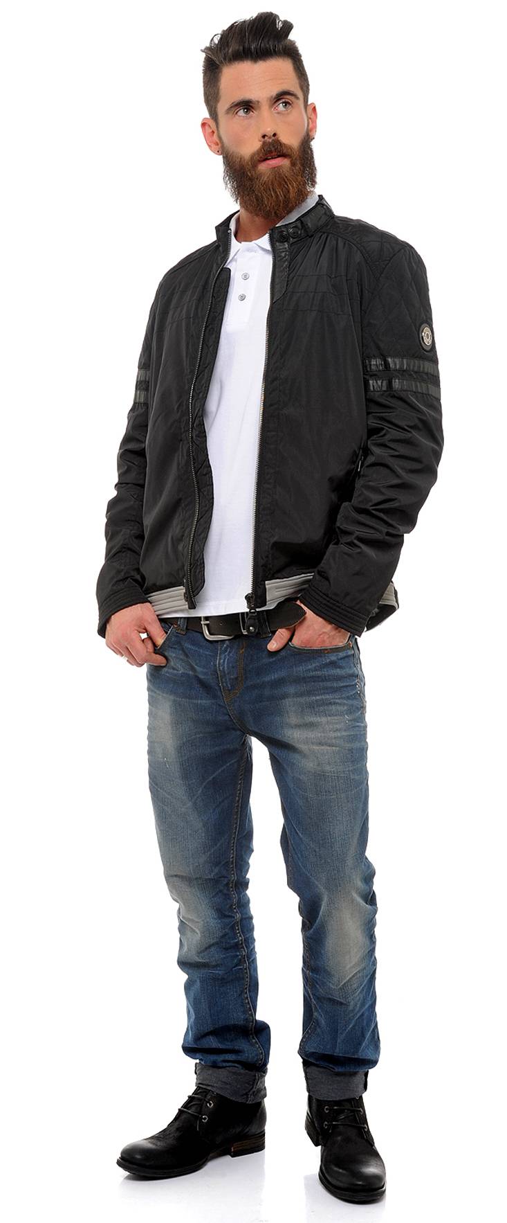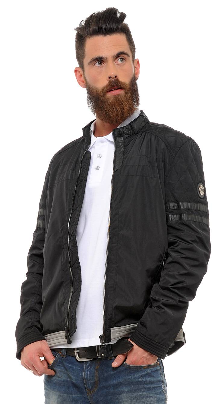Blouson en polyester, esprit Moto, fermeture milieu devant par un zip métal et petit col montant avec label de marque plastique et 1/2 bande fantaisie en tissu contrasté effet Jeans enduit - Poignets zippés - Jeux de matelassage et surpiqures fantaisies - 2 poches zippées en bas - Bandes en tissu contrasté jeans enduit sur le haut des manches - Ceinture grise avec pattes de serrage sur les côtés et fantaisie sous le col dos. À l'intérieur : doublure filet grise avec sérigraphie noire et 2 poches zippées vertical.