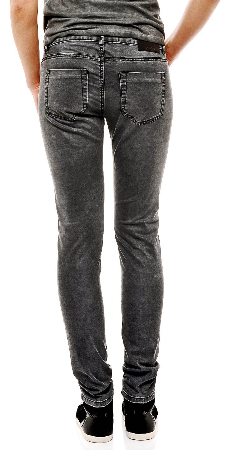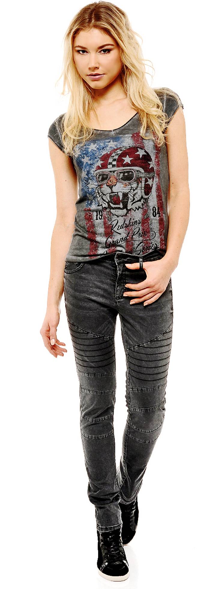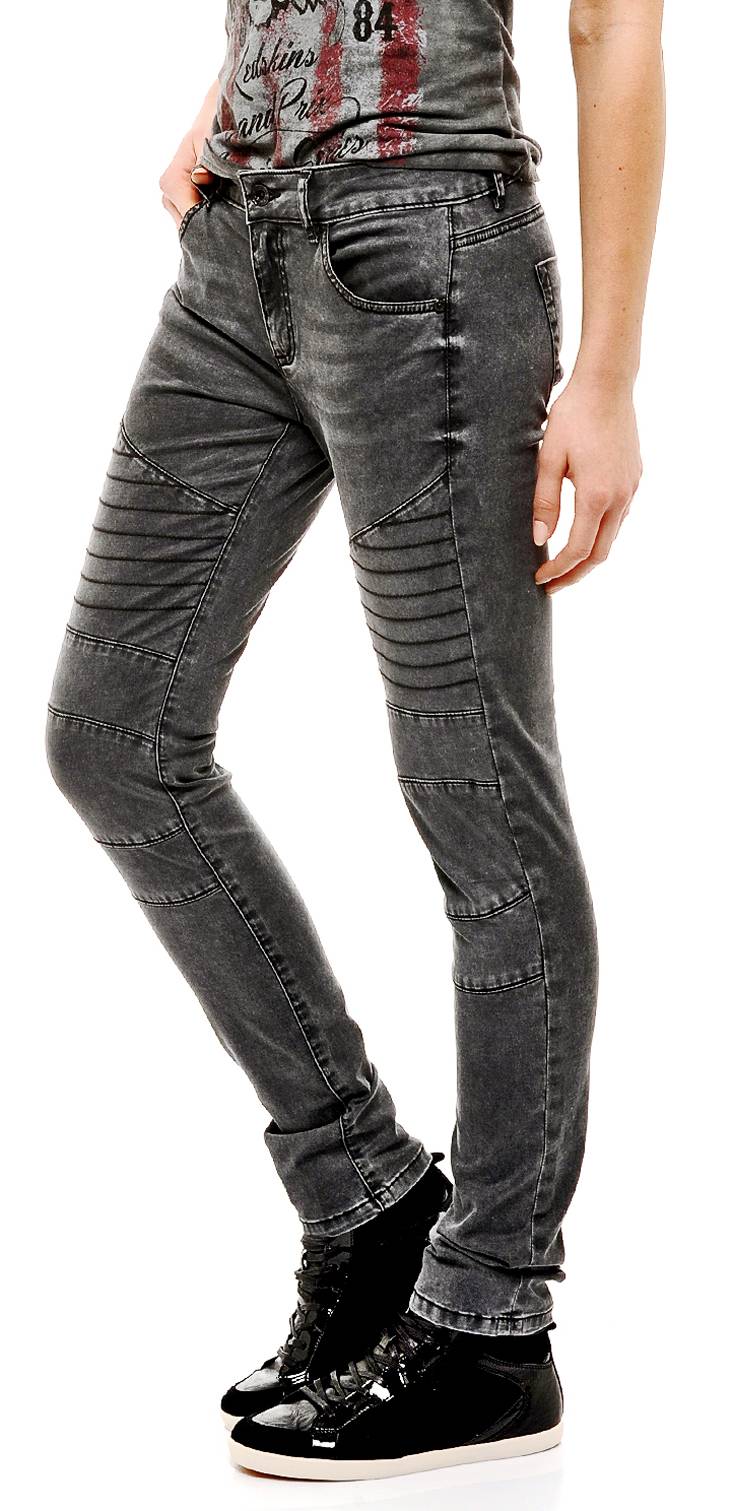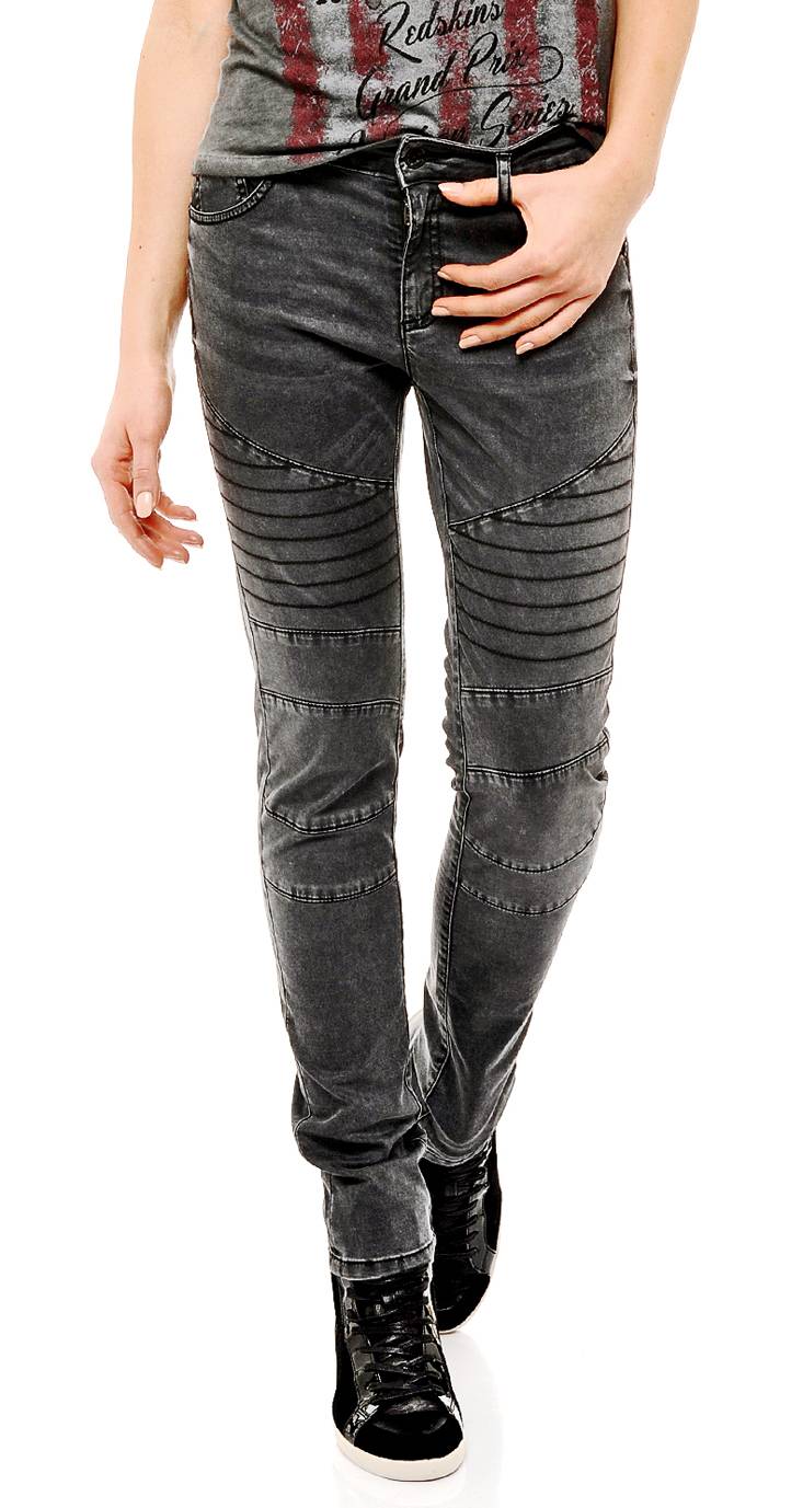 Jeans slim type « Motard »- 5 poches - Braguette zippée - 5 passants - Rivets aux bas des entrées de poches devant - Surpiqures ton sur ton - Jacqueron en cuir sur la ceinture côté droit au porté - Découpes aux cuisses et aux genoux sur le devant.
