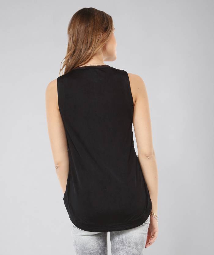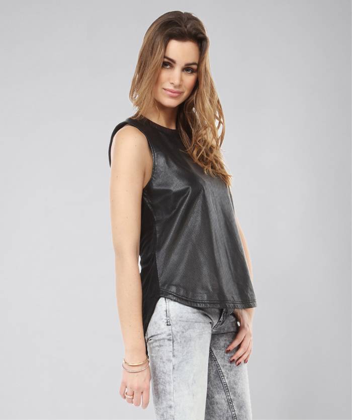 Tee-shirt sans manches, Devant en cuir d'agneau perforé - Dos en maille rayon - Bord côte bicolore - Plaque métal au bas du tee-shirt gauche au porté.
