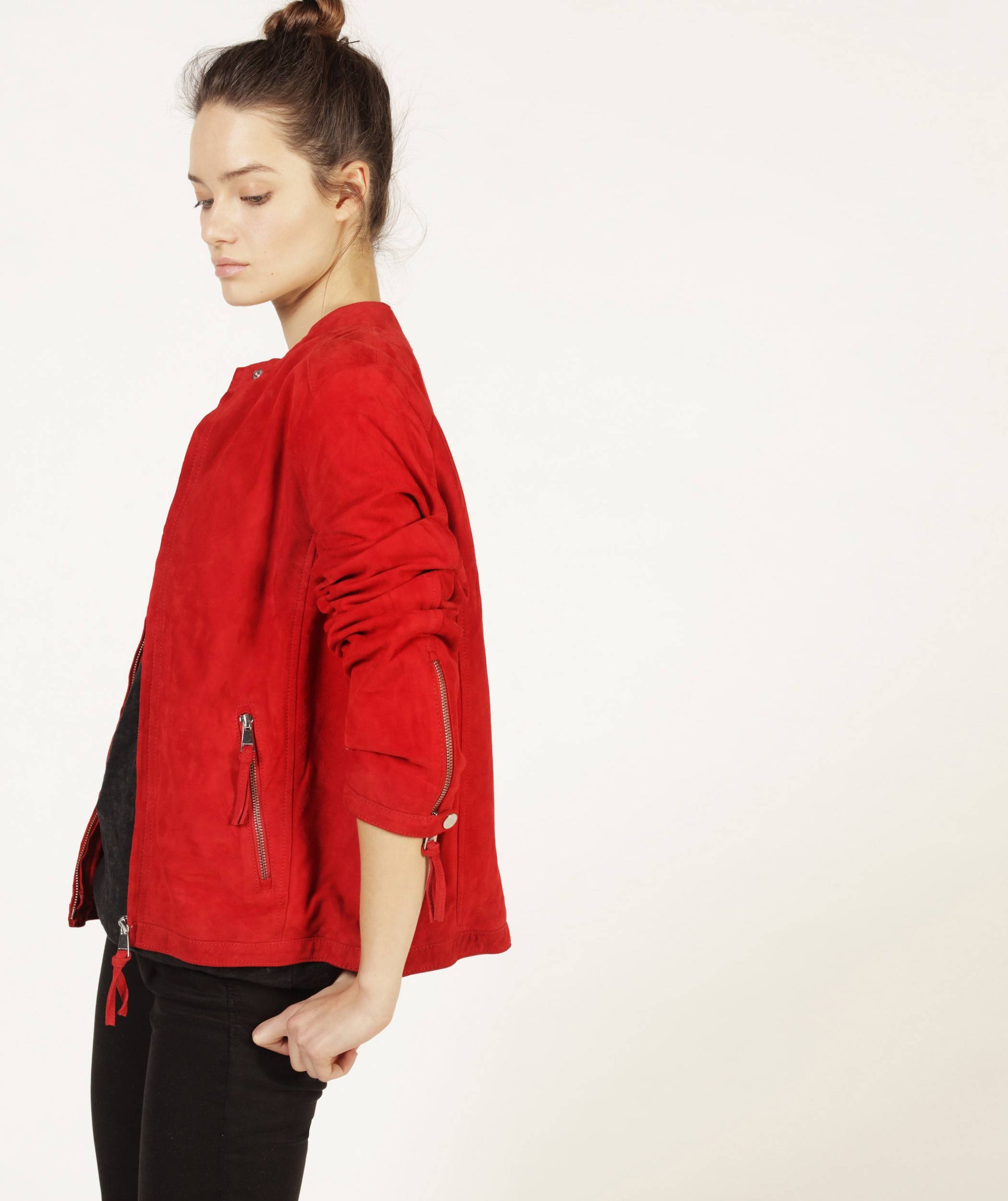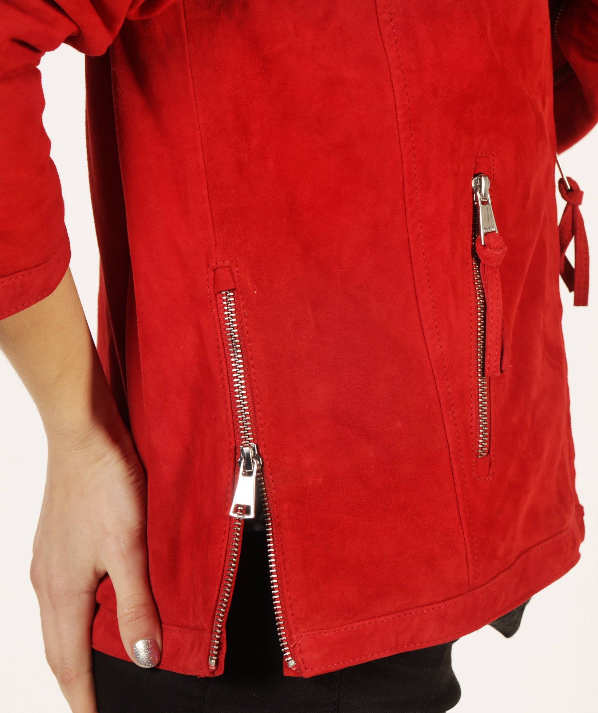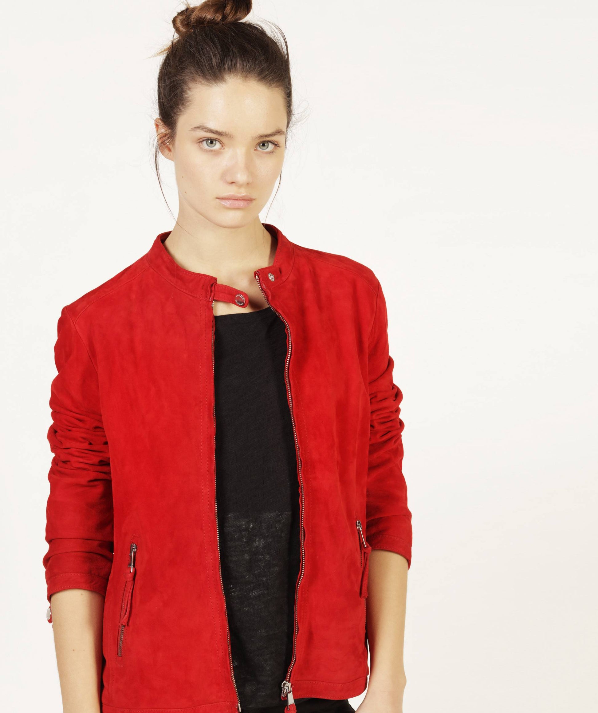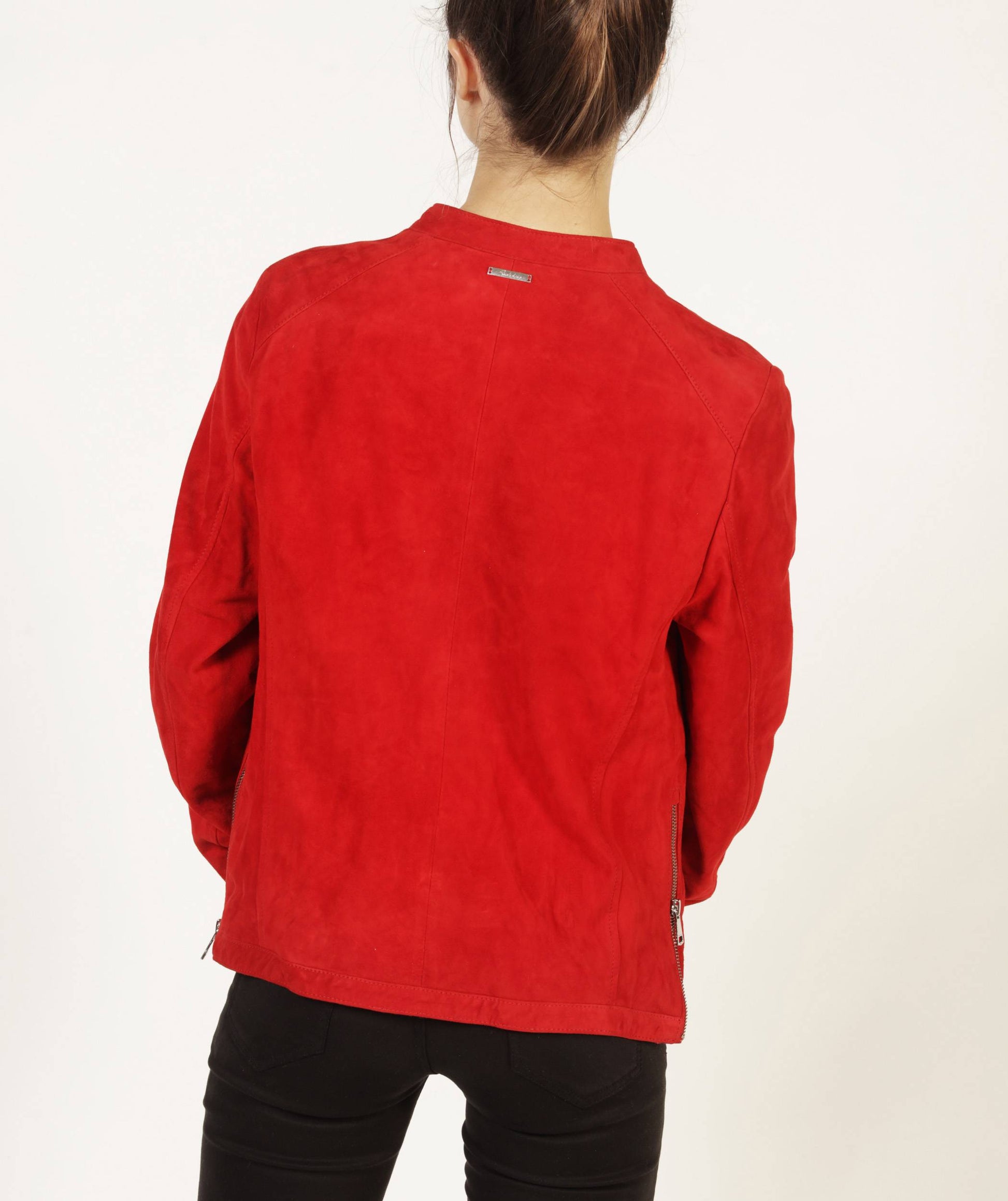 Le blouson masculin s’invite dans la garde-robe de Madame sous le nom de NOIDA AFRICAN. En daim et col montant, il s’agrémente de poches basses zippées, d’une fermeture à glissière en métal et de la doublure signature de REDSKINS. Pour soulignant les formes, des zips viennent se nicher sur les côtés. Ultime clin d’œil métallique, le nom de la maison cousu dans l’encolure du dos.