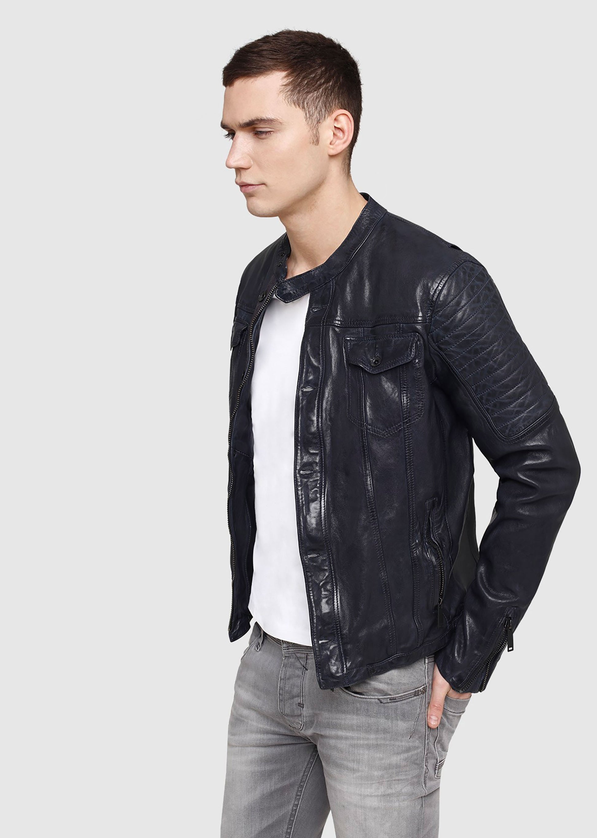 Le blouson en cuir FINCHER JANEIRO est un classique aux détails décalés. Réalisé dans un cuir brut avec des empiècements striés sur les manches et un col à pression, les zips habituels sont remplacés par des boutons qui ornent la fermeture et les poches pour un style atypique et assumé.