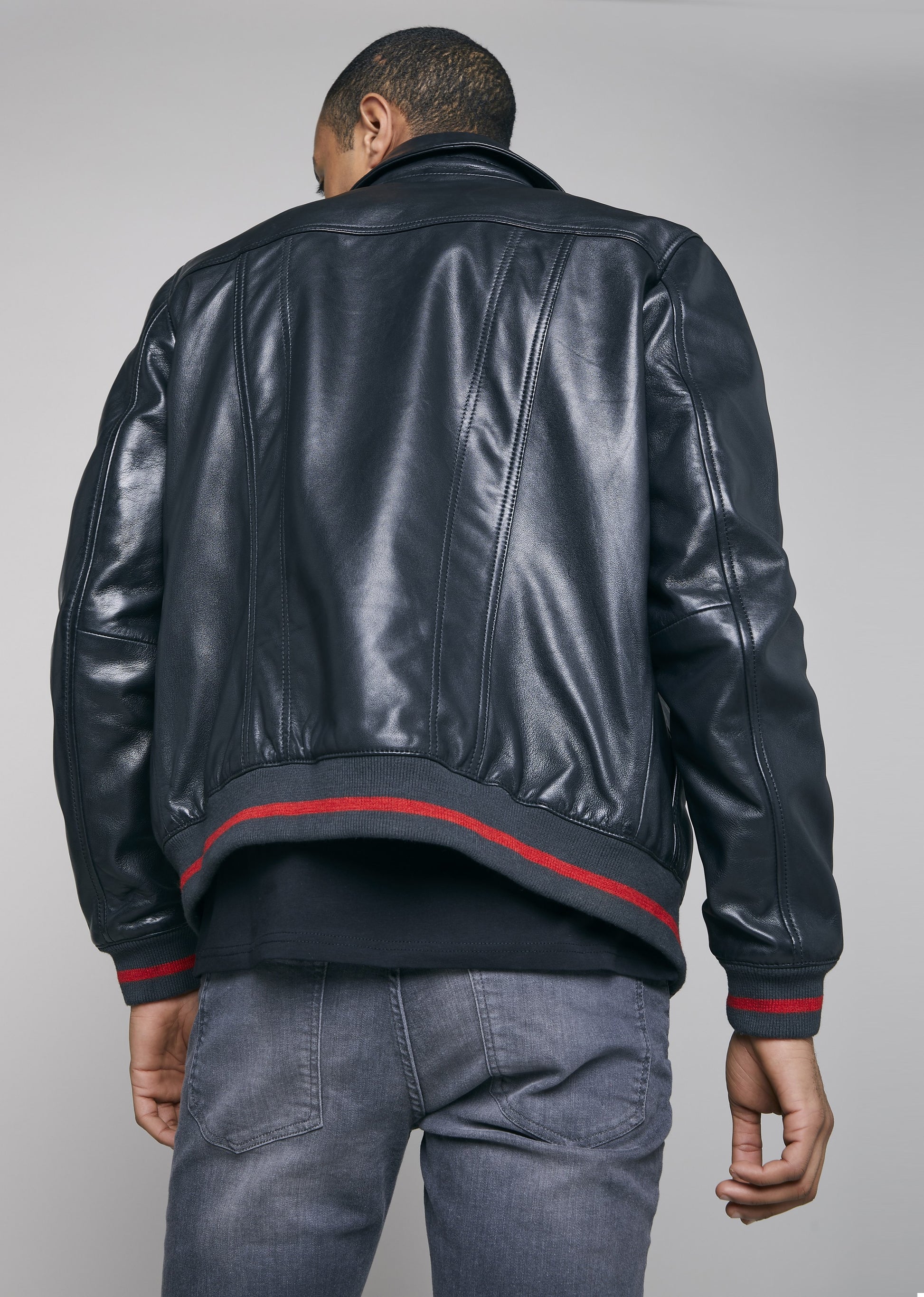Le blouson en cuir de mouton ROWLEY STARTUP au col chemise, dispose d'une fermture zippée et de poches latérales zippées. Les découpes et les bords-côtes rayés rouge confèrent à cette pièce d'exception un style singulier.