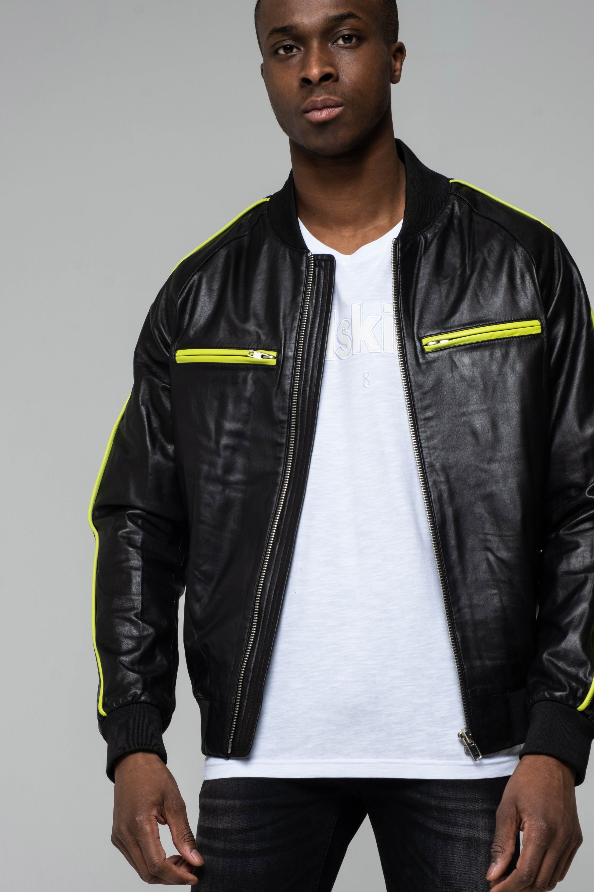Le blouson UNATHI REFRESH en cuir lisse dispose d'un col teddy. Il dispose de bords côtes en bas de manches, en bas de vêtement et au niveau du col et d'une fermeture zippée. Les manches sont ornées d'une bande de cuir vernis à liserés fluo. Composition : Cuir d'agneau Notre mannequin porte une taille L, Hauteur 1m82, tour de poitrine 96 cm, tour de taille 79 cm.