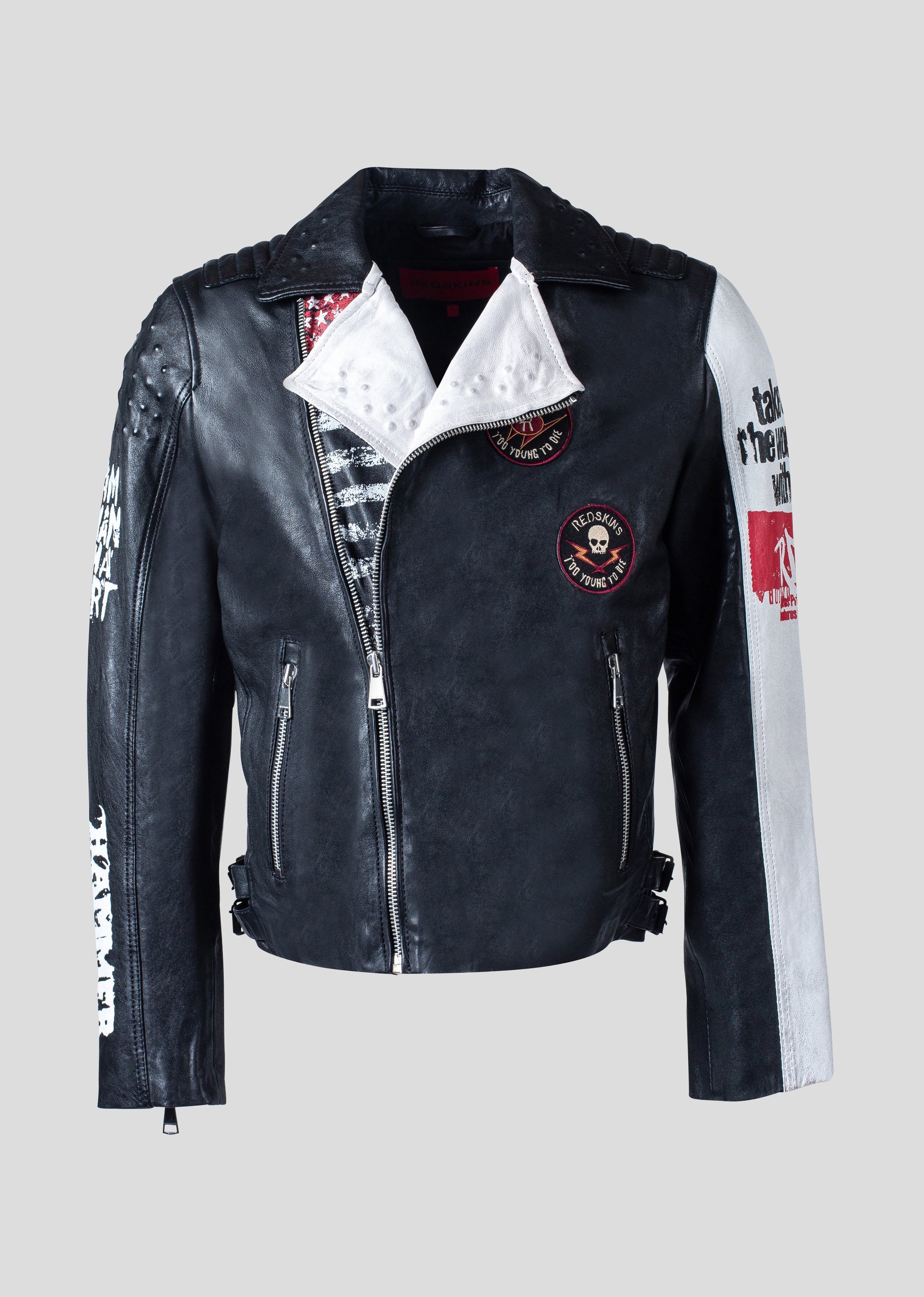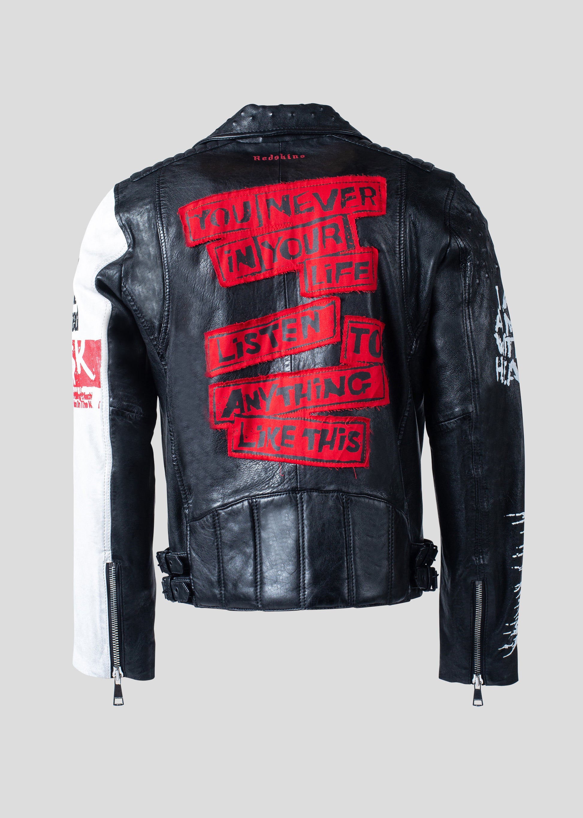 Unique, le perfecto Clash Calista est composé d’un col cavalier avec fermeture zippée décentrée et bouton pression. Son originalité se traduit à travers les différents motifs réalisés et sa qualité. Un vrai clash de noir et de jaune avec des écritures au dos et sur les bras. Elle se compose aussi de deux sangles avec boucles métalliques de chaque côté et d’un empiècement en courbe au bas du dos. Cuir de Mouton