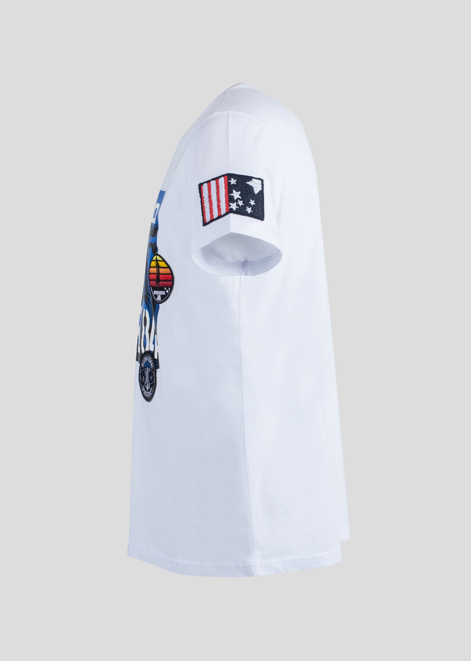 Le t-shirt ORION YARD est disponible en col rond et à manches courtes. On retrouve plusieurs éléments du thème "espace" notamment des fusées ou drapeau. 60% coton - 40% polyester