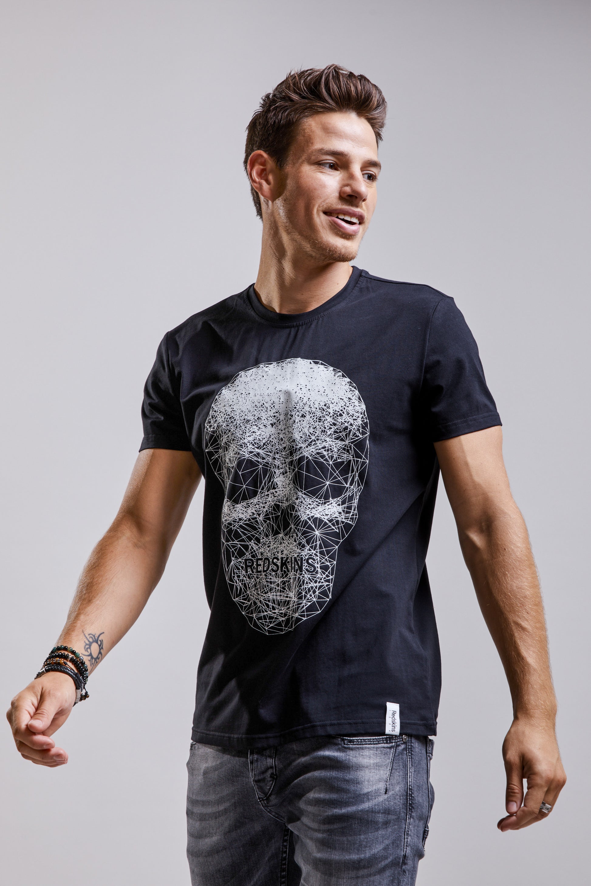 Le t-shirt HEAD CALDER en coton est disponible en col rond et en manches courtes. Avec le design unique de sa tête de mort, il est parfait pour l'été. Composition : 95 % coton - 5 % elasthanne