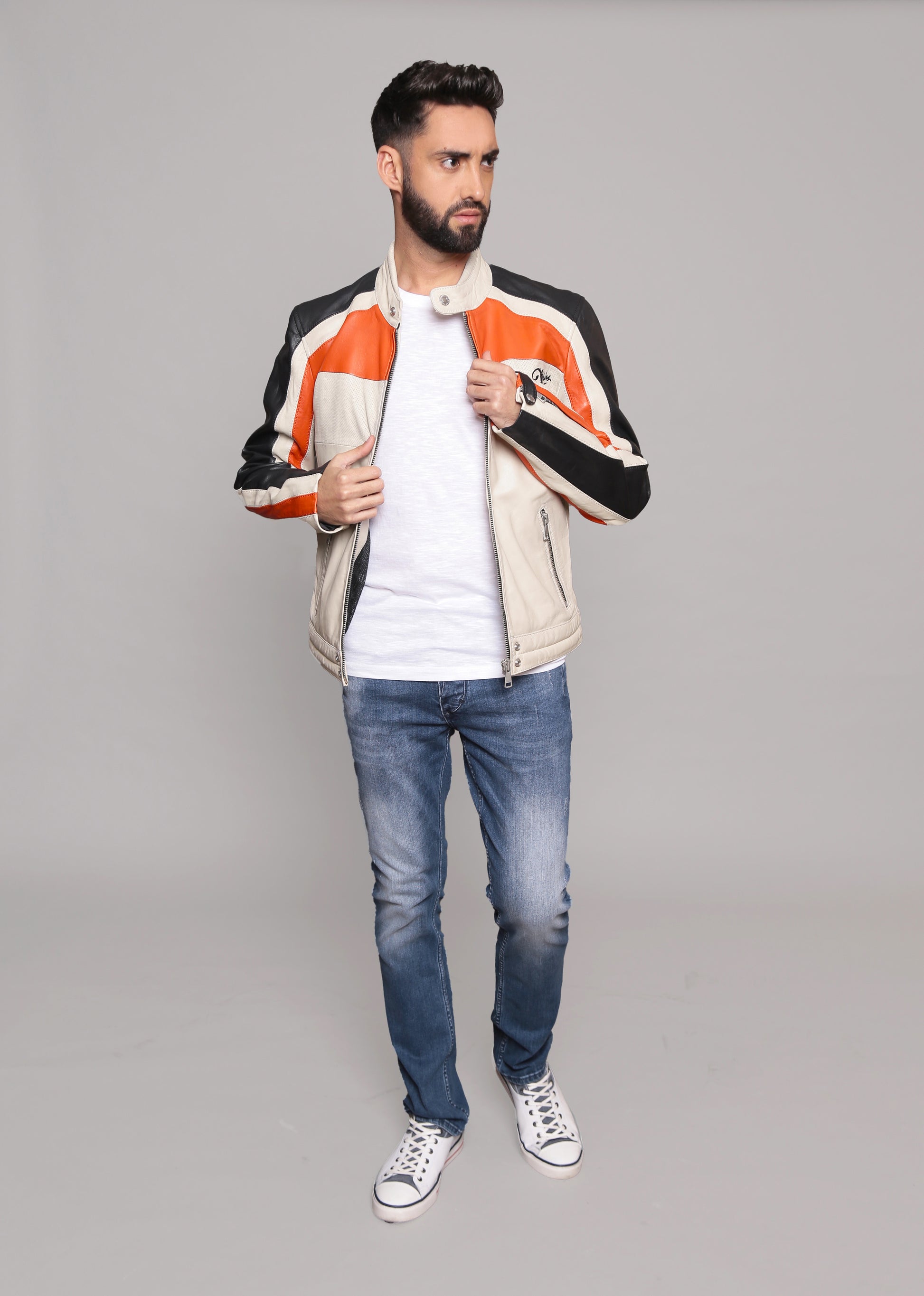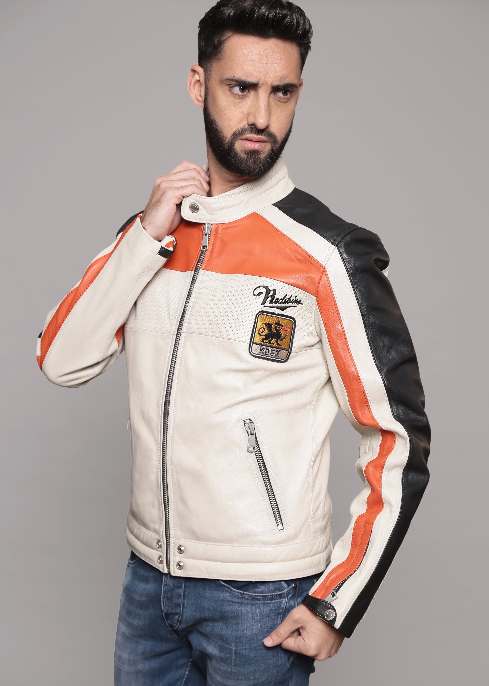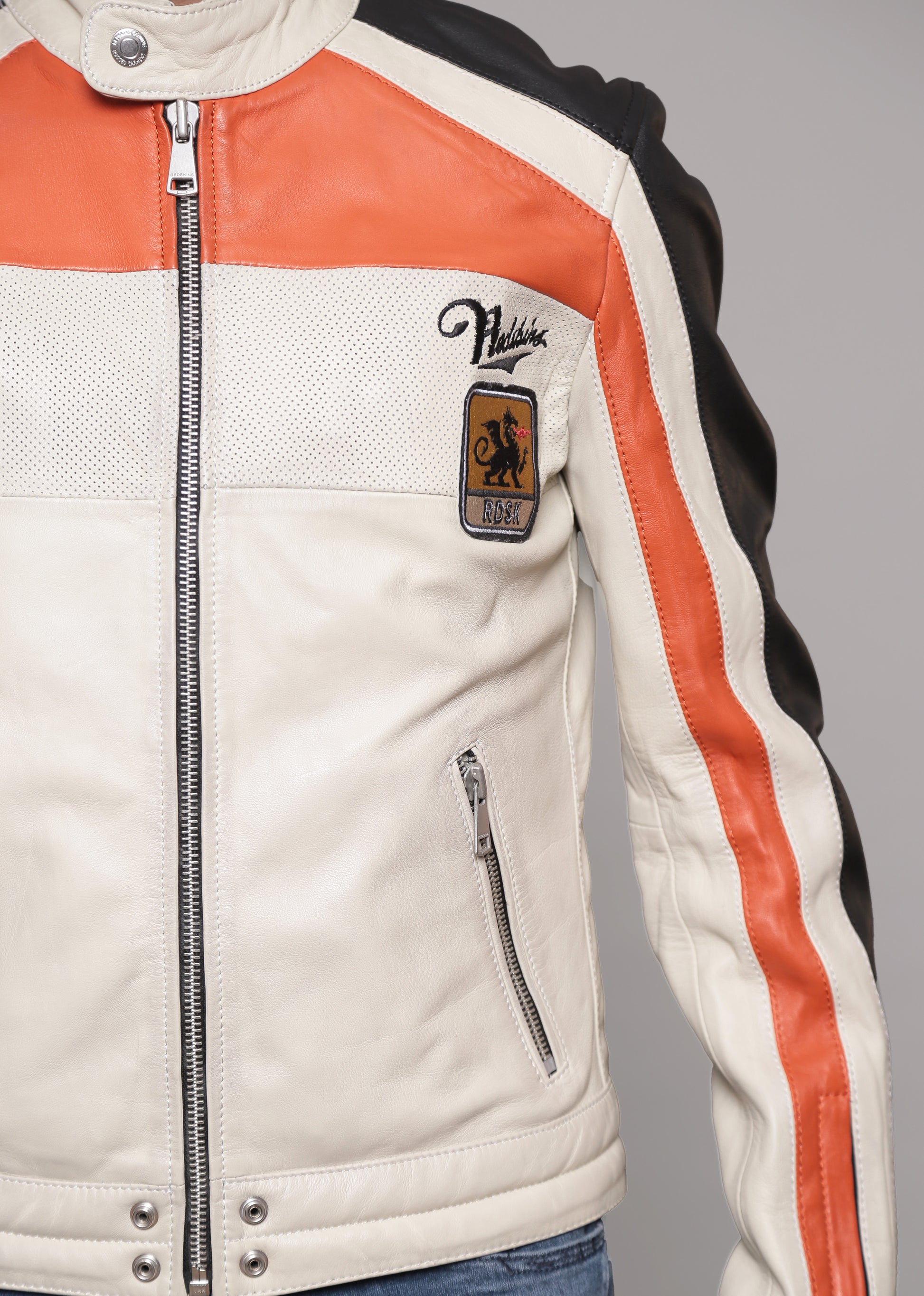 La veste en cuir de mouton NOTY TRIPWAY de REDSKINS est un must have de la mi-saison. Ses détails, son originalité et sa qualité lui confèrent l'attribut d'un look réussi. Son atout ? c'est sa coupe parfaitement droite, ses couleurs contrastantes ainsi que l'impression du logo sur le dos et les visuels côté coeur. Elle est dotée d'un col mao à pression, de deux poches zippées et des zips au niveau des poignets. Elle dispose de multiples boutons pression sur le bas et se ferme grâce à un zip à l'avant.