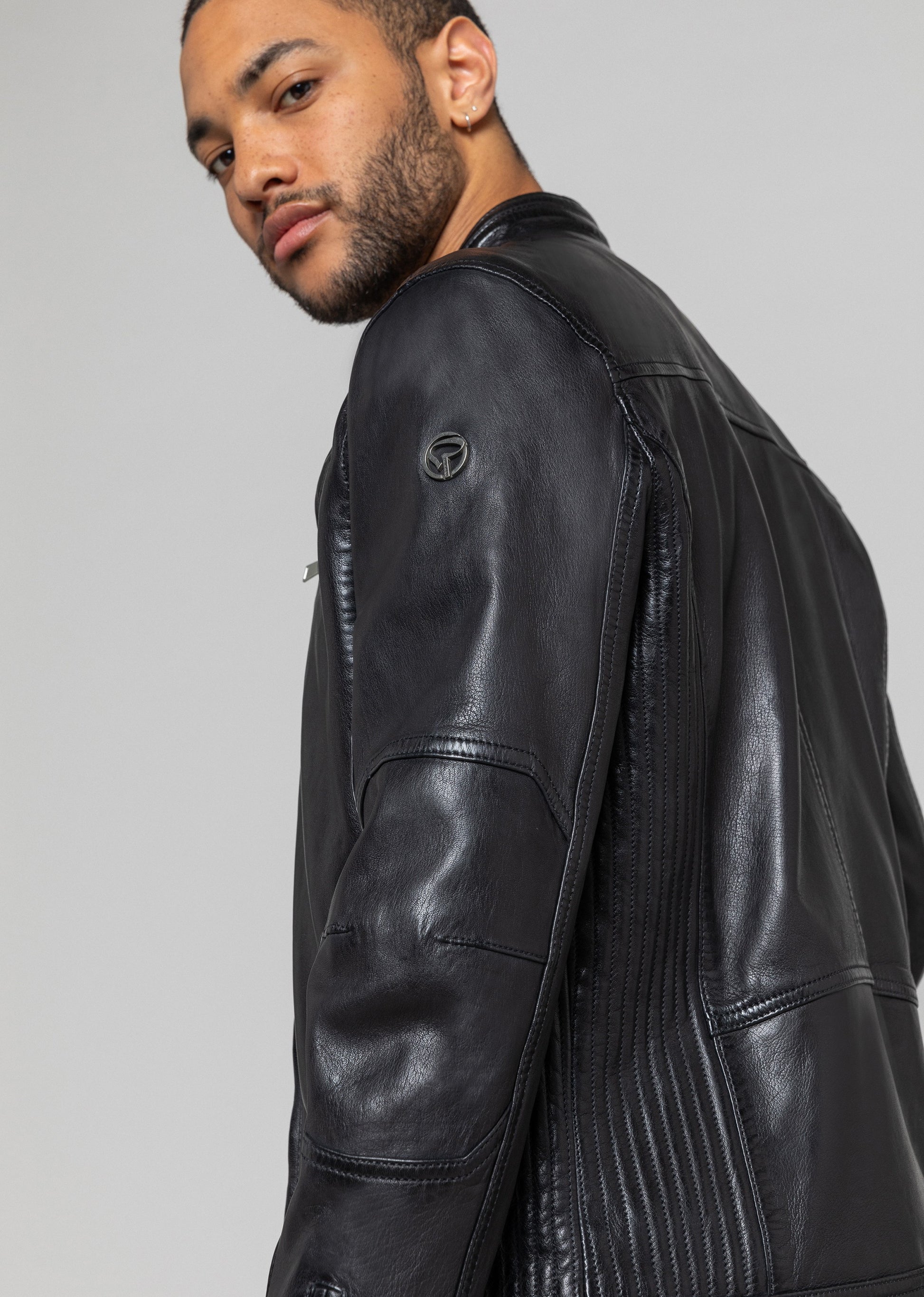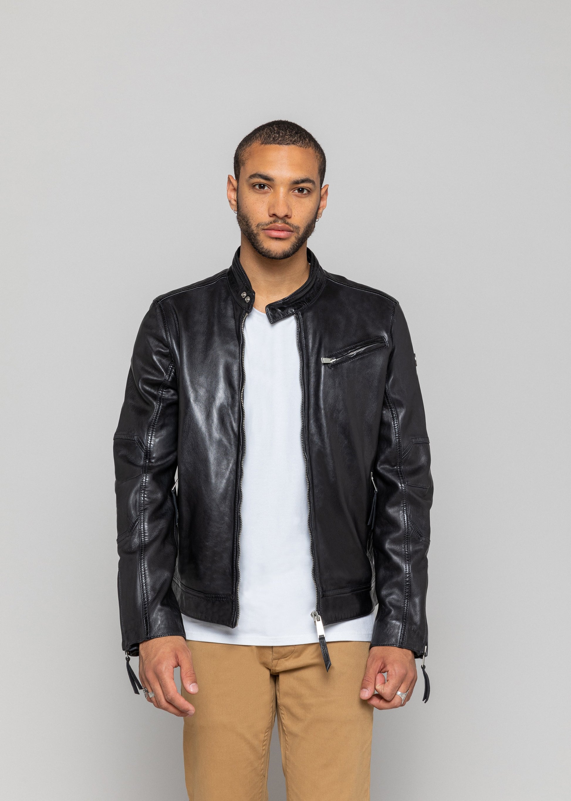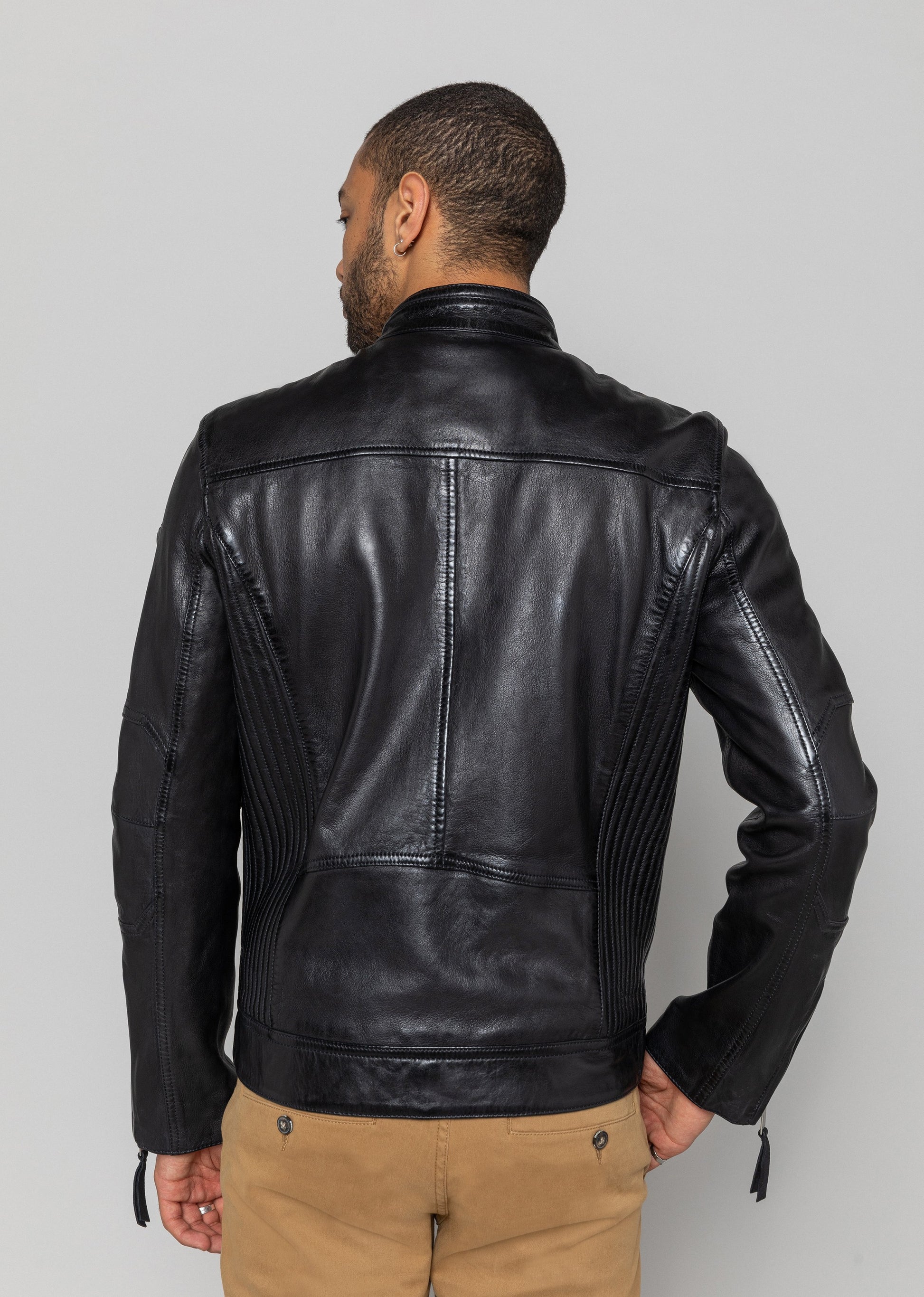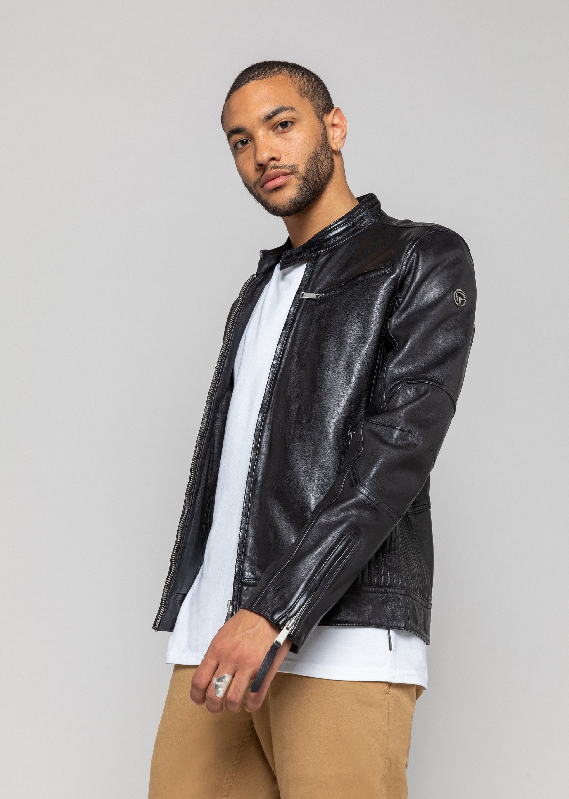 Le blouson en cuir TRUST VICTORY made in REDSKINS se distingue par une coupe près du corps et une allure motarde avec un col mao à pression, des empiècements striés, des surpiqûres et des zips au niveau du poignet et des poches. Le blouson est doté d'ailleurs d'un badge minimaliste sur la manche gauche. Composition : Cuir de mouton