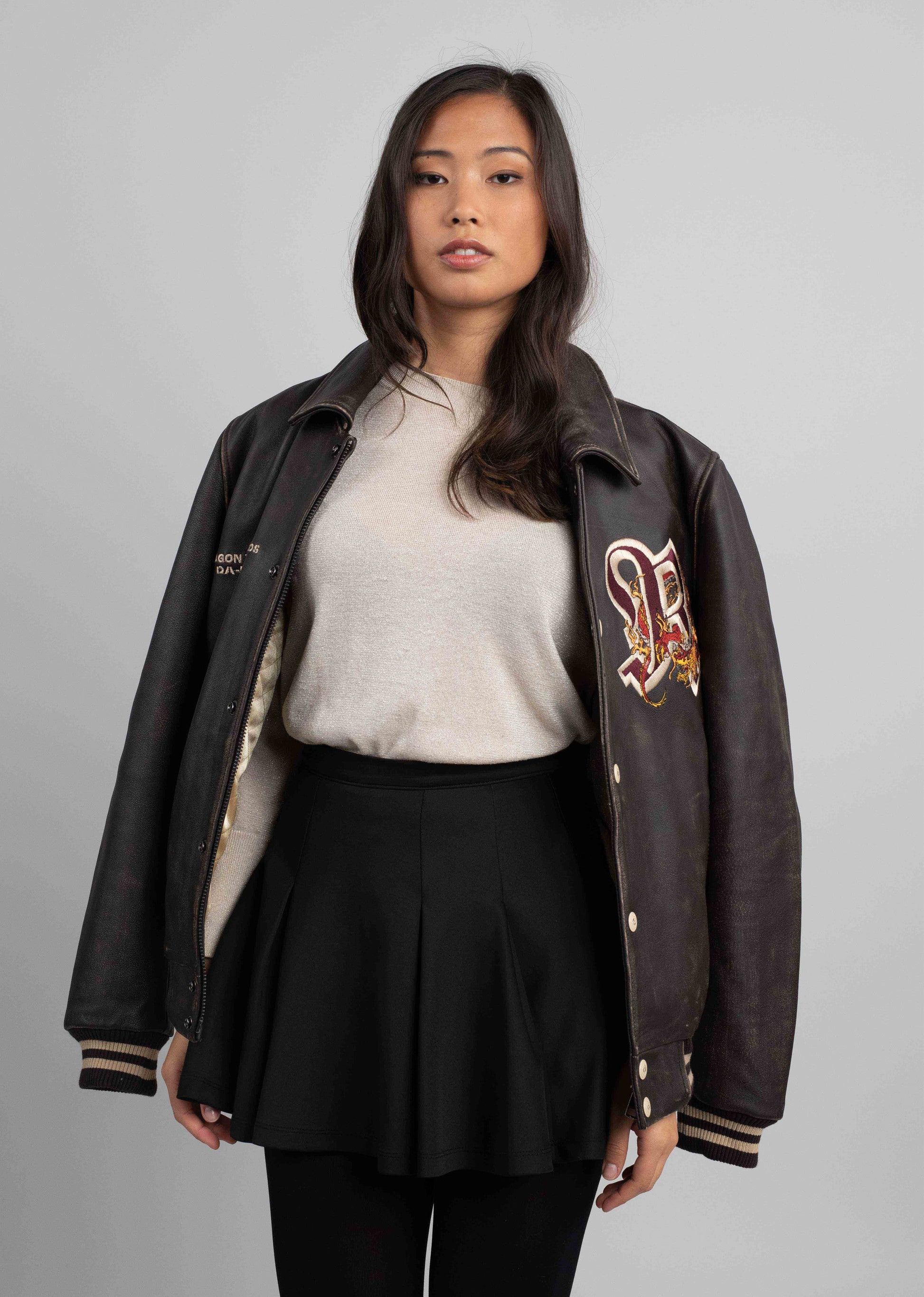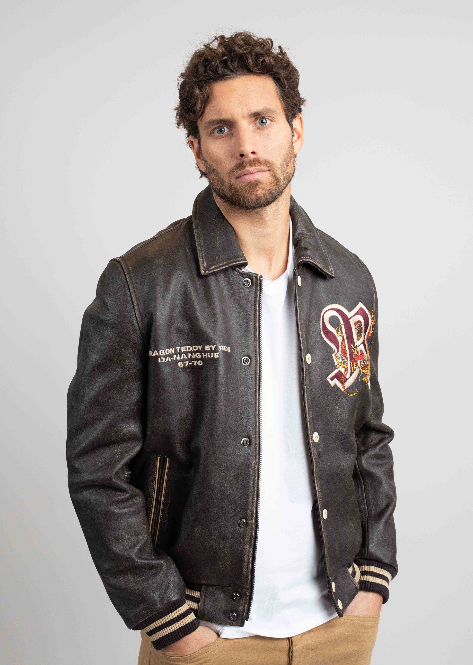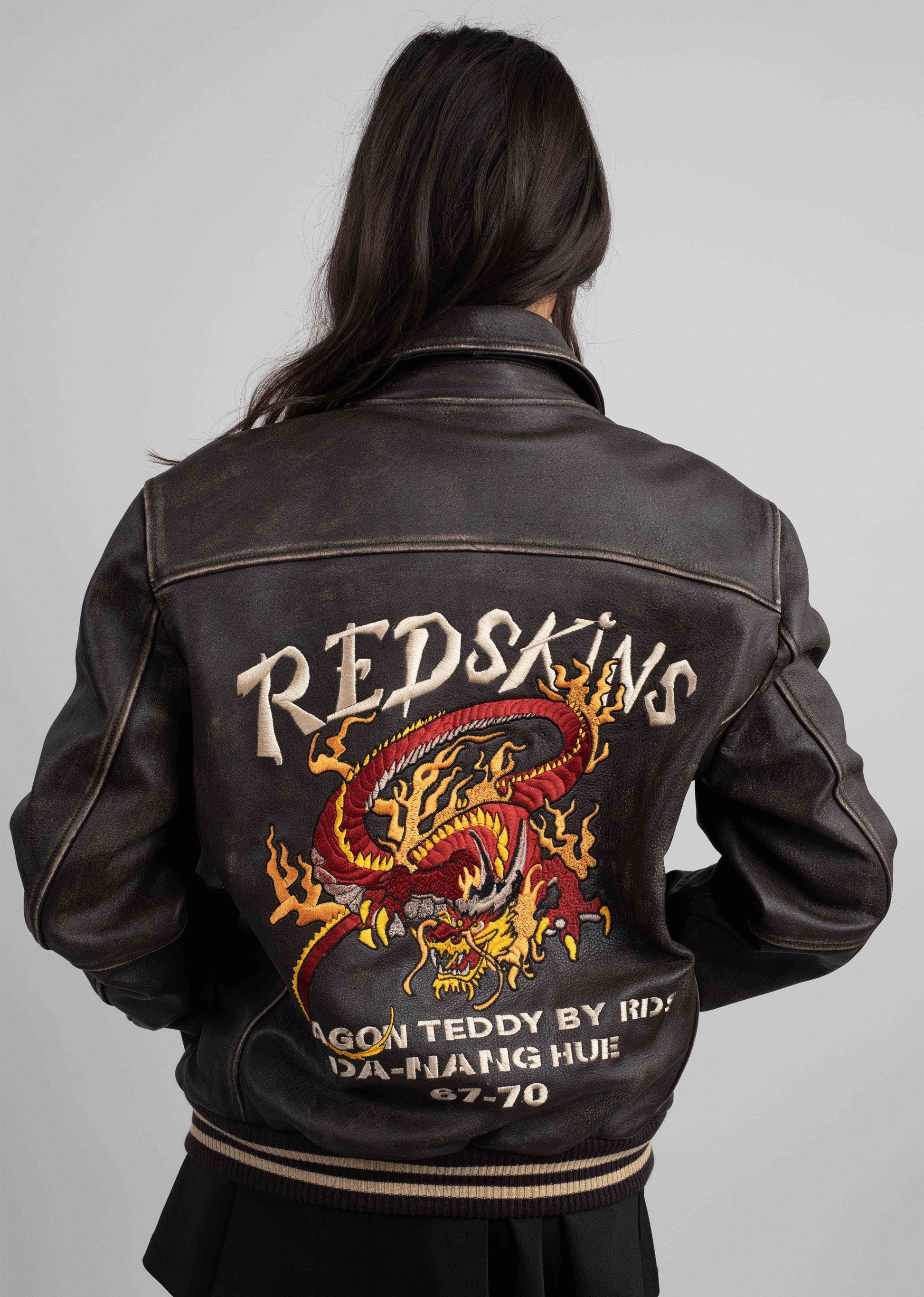 Découvrez le CUIR DRAGON COHIBA, veste style oversize, broderie d'un dragon et de "Redskins" dans le dos, broderie "R" sur la face avant gauche et broderie d'un petit texte sur la face avant droite, 2 poches passepoilées latérales, fermeture à boutons de pressions, parfait pour un style moderne et attrayant, composition : cuir de vache, nos produits sont cintrés, il est recommandé de prendre une taille au dessus !