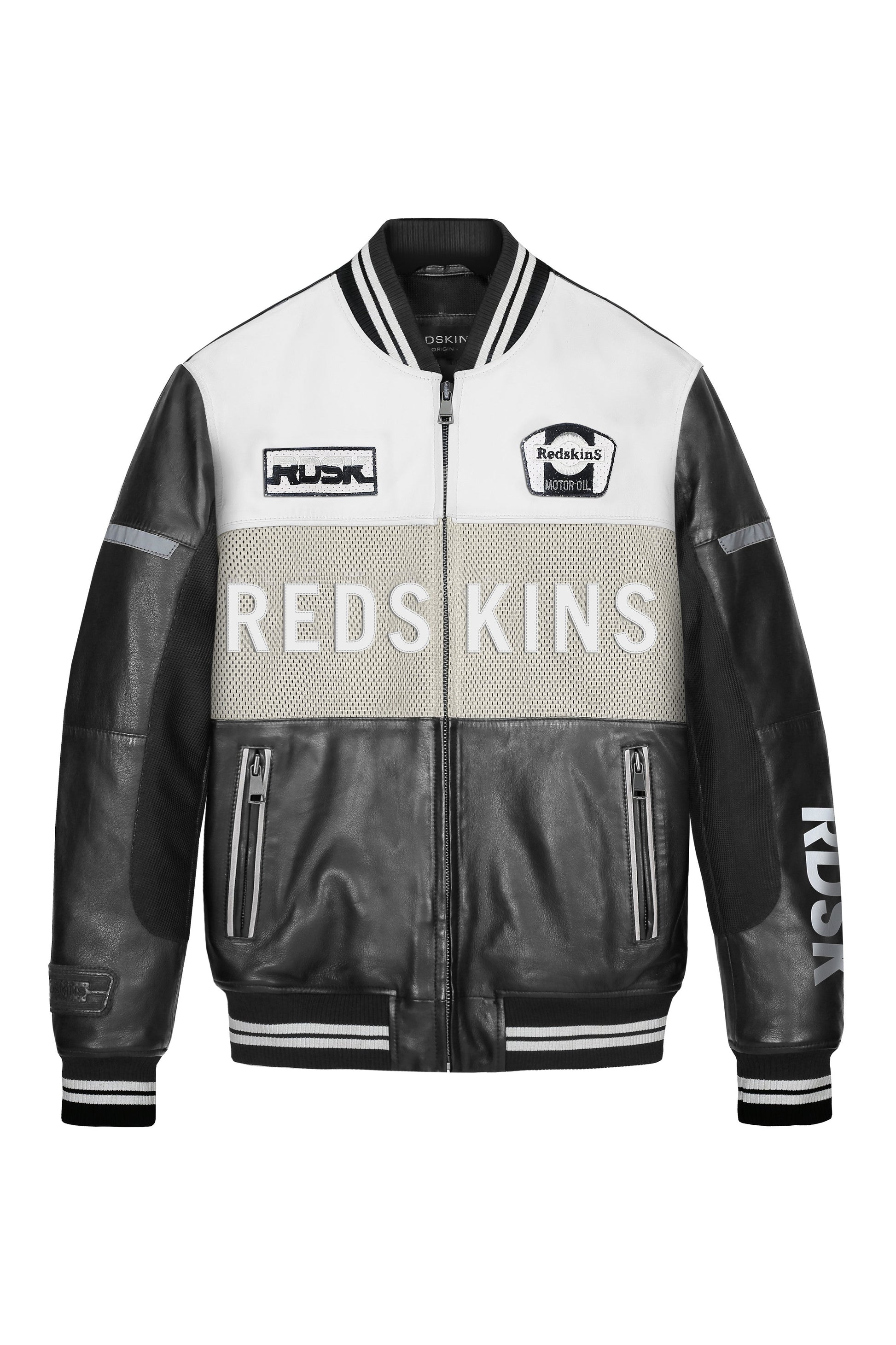 Découvrez le CUIR NOGARO RACING, col teddy, fermeture zippée, 2 poches avant zippées, 2 poches intérieures zippées, 2 broderies REDSKINS au niveau du torse, inscription REDSKINS brodée au centre de la veste, inscription "RDSK" imprimée sur la manche gauche, broderie REDSKINS sur la manche droite, inscription REDSKINS imprimée à l'intérieur de la veste, partie en mesh sous chaque manche au niveau des aisselles, partie de mesh également au centre de la veste, composition : cuir