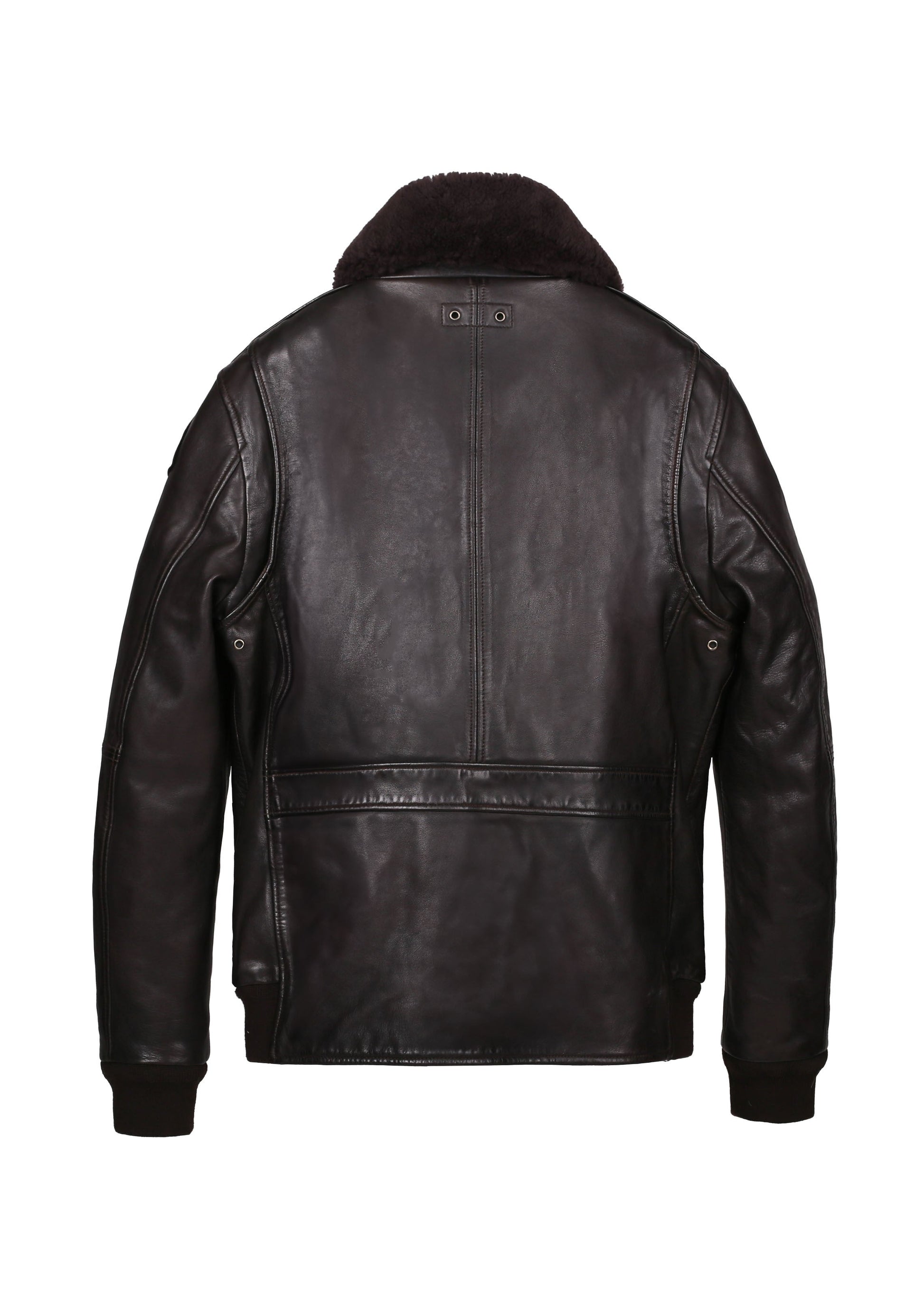 Blouson en cuir avec un col rabattu en fourrure 2 poches à rabats à l'avant, 2 poches zippées sur le bras gauche et droite et 2 poches intérieures 5 patchs aviations