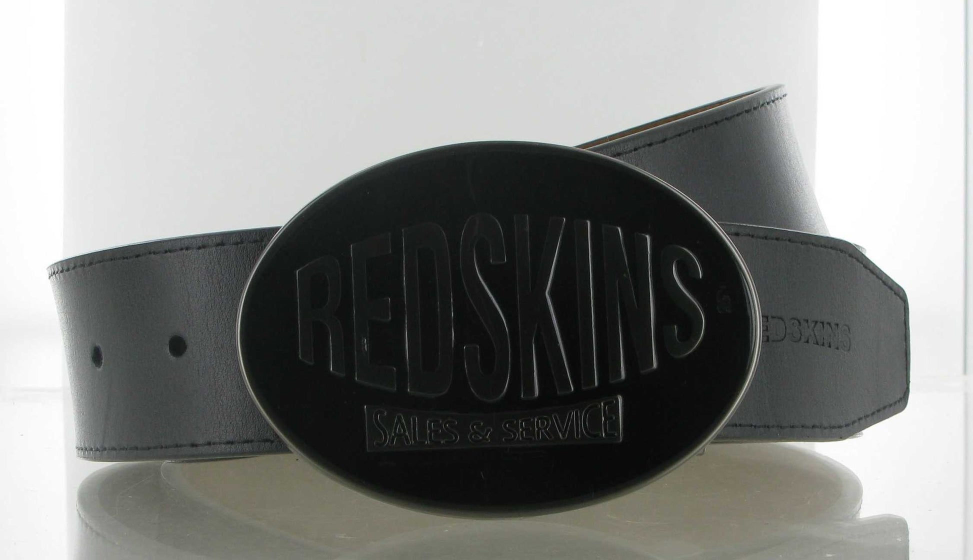 Refente de cuir de vachette lisse doublée refente de cuir de vachette vieillie, boucle plaque gravée « Redskins Sales &Service » en relief, Zamack aspect canon de fusil satiné et laqué noir.