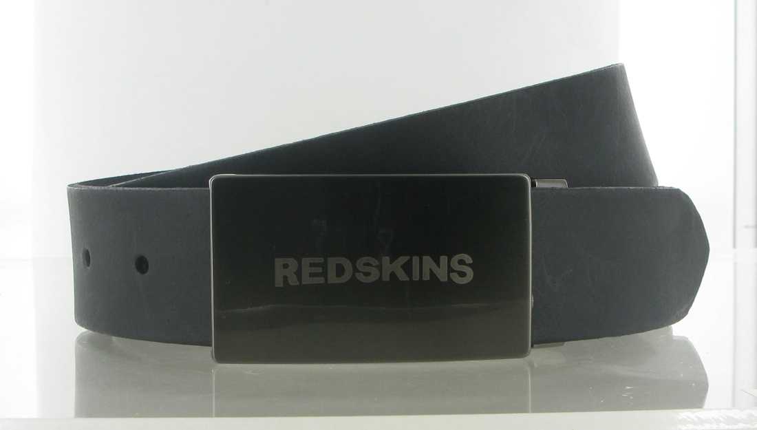 Refente de cuir de vachette pigmentée, Boucle plaque laserisée « Redskins », Zamack aspect canon de fusil satiné.