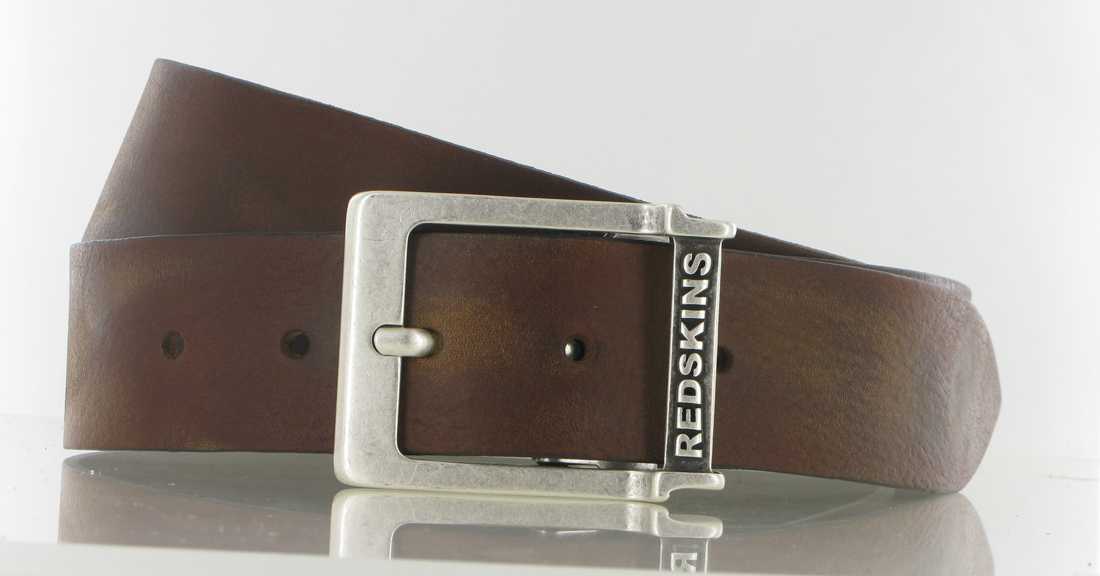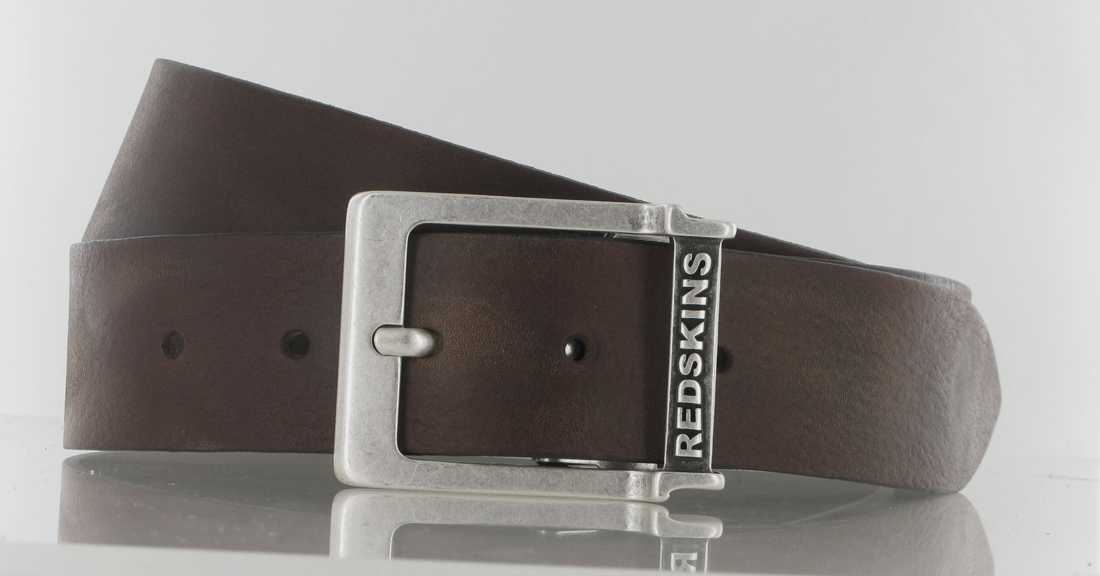 Ceinture 40 mm réglable en cuir de vachette végétal foulonné poncé, Boucle ardillon gravée « Redskins » en relief, Chape métal, Zamack aspect vieux nickel.