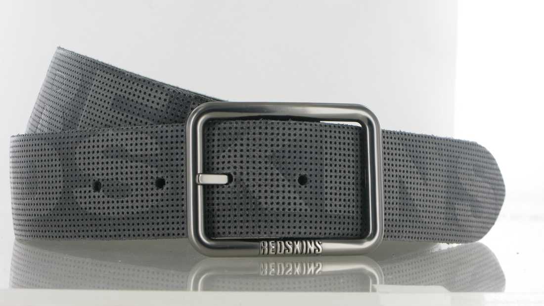 Refente de cuir de vachette lisse, impression "Petit piqué" et « Redskins » en relief estampé à chaud tout le long de la ceinture, Boucle ardillon gravée Redskins en relief, Zamack aspect canon de fusil mat.