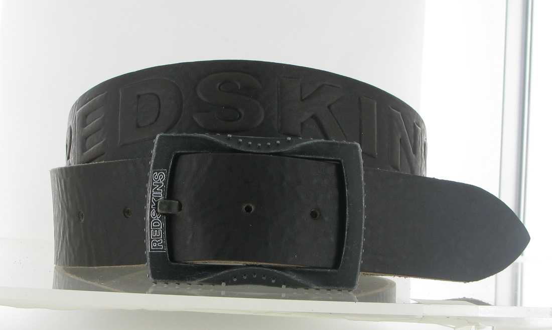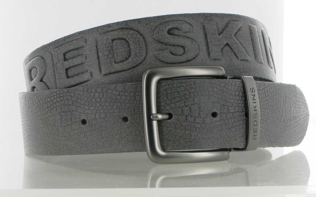 Ceinture 40 mm réglable. Refente de cuir de vachette lisse, impression lézard tout le long de la ceinture, « Redskins » en relief estampé à chaud au dos, Boucle ardillon, gravée « Redskins », Zamack aspect canon de fusil mat.