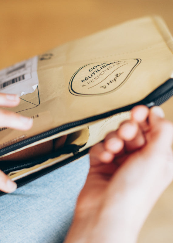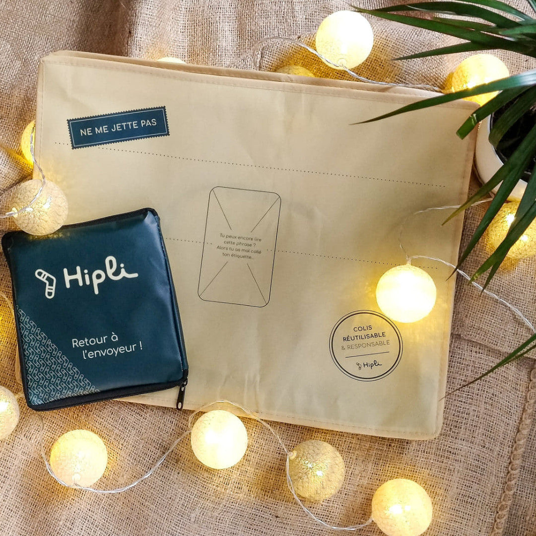Les colis réutilisables Hipli sont proposés en option. A réception, vous découvrez vos achats et repliez le colis en suivant les instructions présentes au dos. Pour le renvoyer, glissez votre colis dans n'importe quelle boîte aux lettres jaune de La Poste (pour vous aider à localiser la plus proche de vous, un QR Code est présent sur le colis). Grâce à l'affranchissement imprimé sur chaque colis, il revient jusqu'à l'atelier d'Hipli, au Havre, où chaque colis est nettoyé, réparé si nécessaire et remis en circulation.